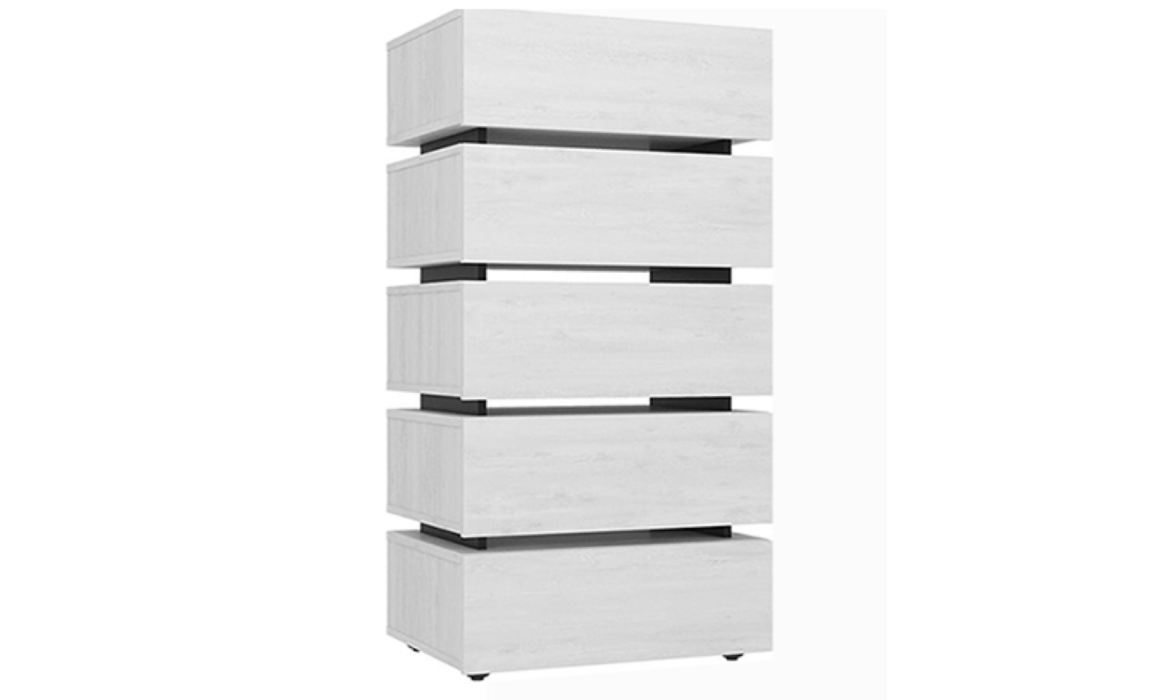 Комод OSLO 6 – практичный и вместительный. Лаконичные гладкие фасады ящиков в декоре Дуб Серый в комбинации с контрастными черными планками делают комод поистине уникальным. Пять выдвижных ящиков глубиной 14 см способны поместить в себя все необходимое, а компактная конструкция сэкономит место в комнате. Все ящики оснащены направляющими полного выдвижения. Такие направляющие делают открывание и закрывание бесшумным.