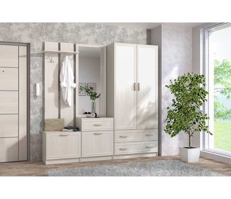 Пример классической мебели в прихожую, сочетающей в себе компактность, эстетичность и функциональность. Светлый оттенок модулей визуально увеличивает помещение, наполняет его светом, а декоративная фрезеровка подчеркивает строгость и сдержанность.
