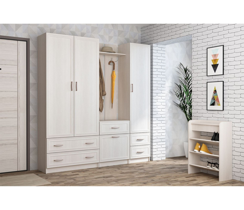 - Вешалка (антресольная полка для головных уборов, два трёхрожковых крючка для одежды) с обувницей (выдвижной ящик и ниша с откидной створкой), 600х2100х390 мм;