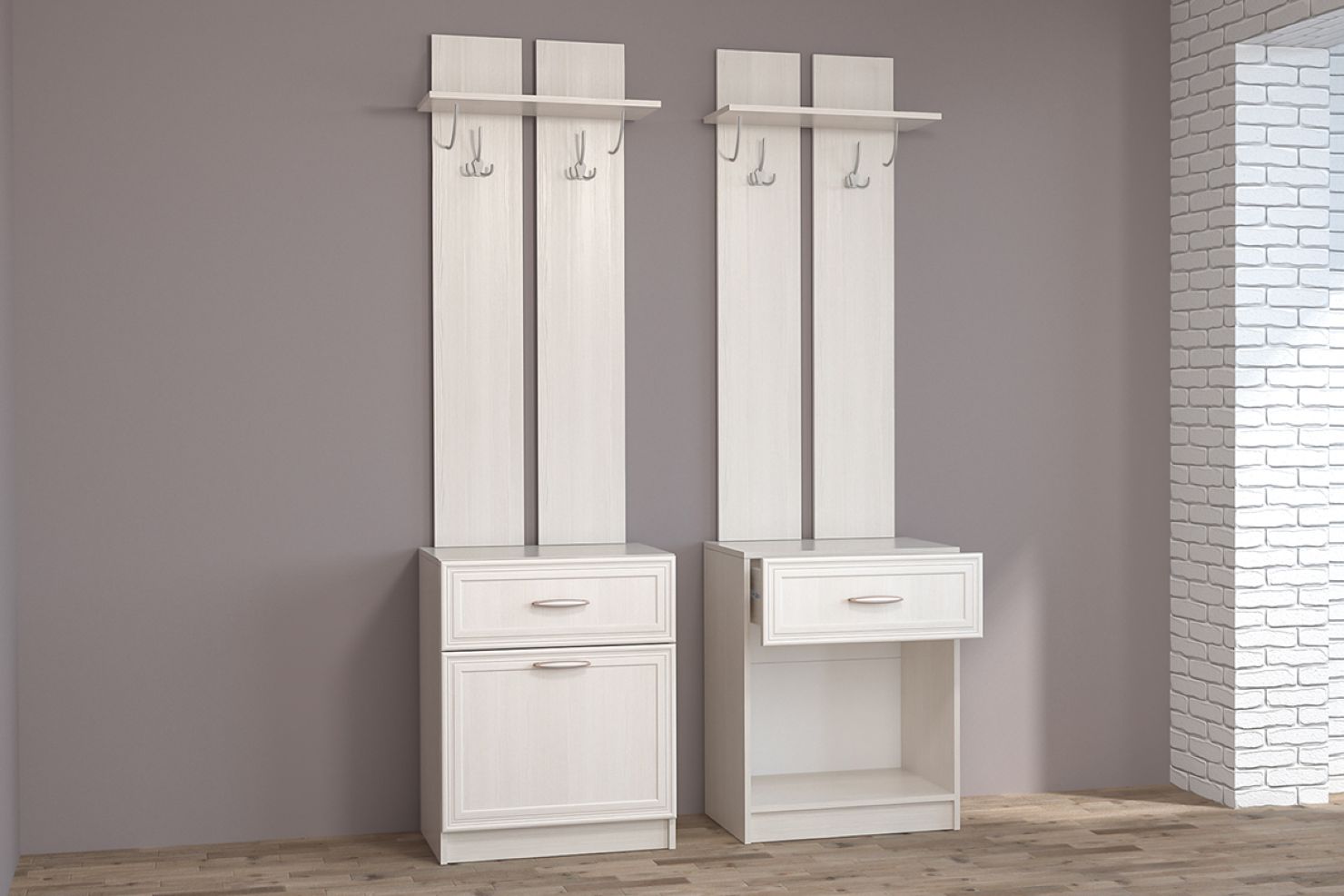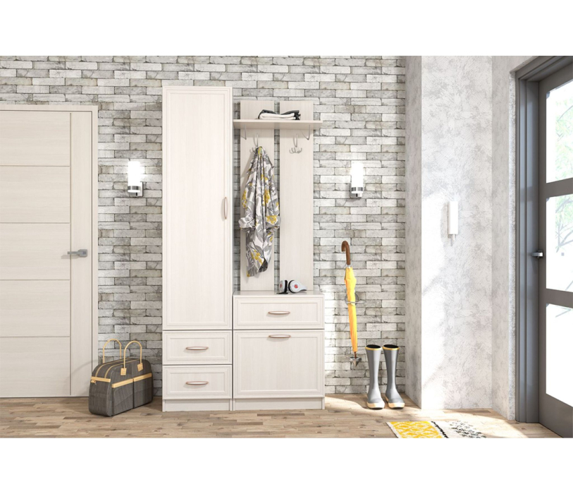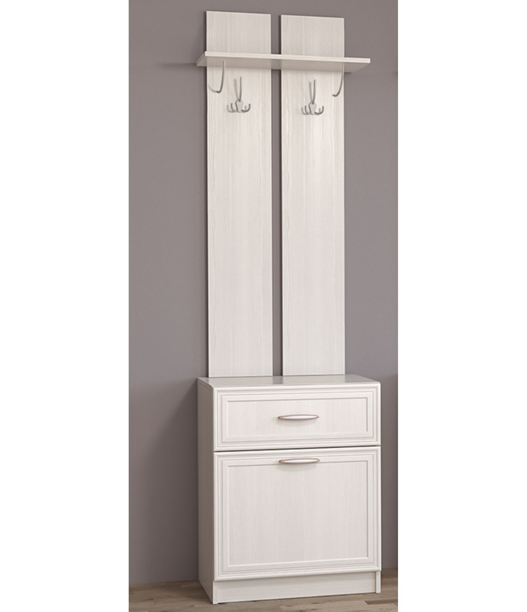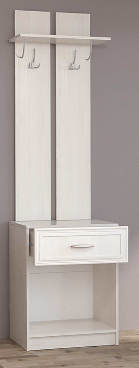 - Вешалка (антресольная полка для головных уборов, два трёхрожковых крючка для одежды) с обувницей (выдвижной ящик и ниша с откидной створкой), 600х2100х390 мм.