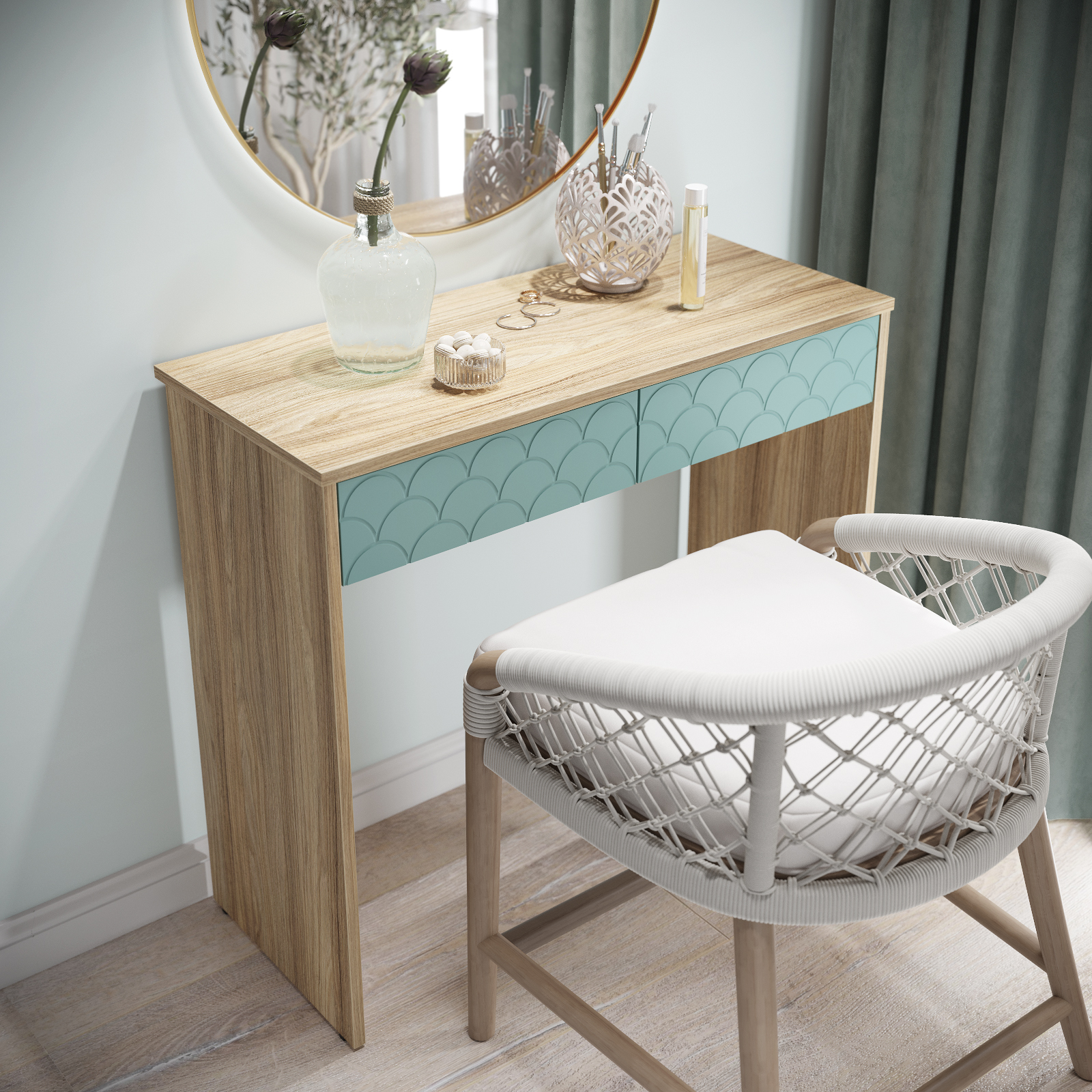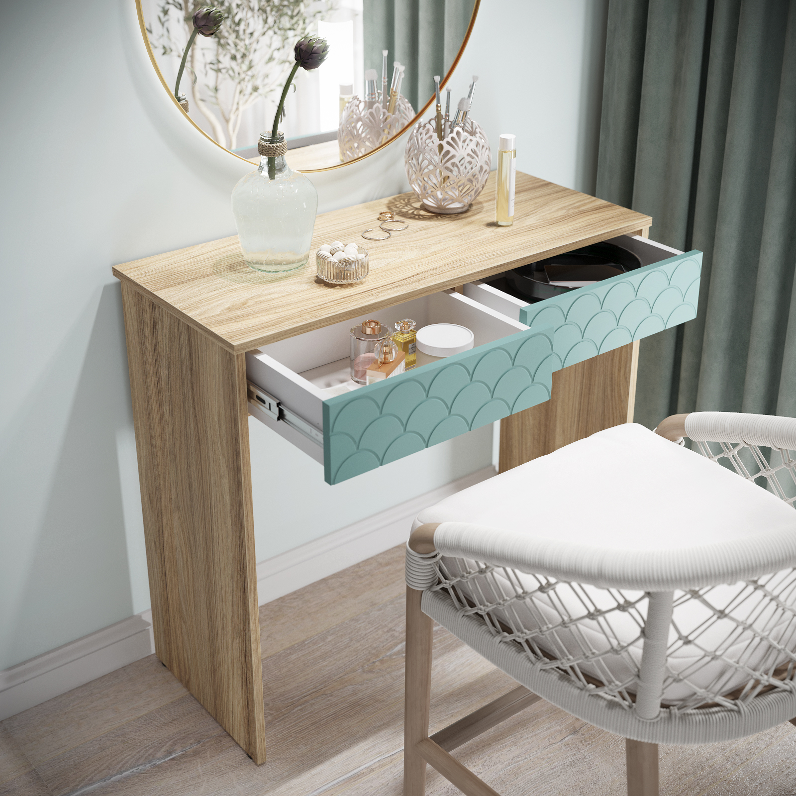 Размеры комплекта (ш/в/г) в мм: 848х760х370 Материал корпуса/фасада: ЛДСП 16мм, МДФ 16мм Стол туалетный Велламо ВО-09 рекрасно впишется в интерьер уютной и комфортной комнаты. Изделие поможет создать достаточно удобное место для наведения красоты. Широкая столешница позволит разместить под рукой все необходимые предметы. Вместительные выдвижные ящики, созданы для бережного хранения косметики, аксессуаров и украшений. Толщина столешницы ЛДСП 16 мм, дно ящика двп 3 мм. Свес крышки в 25 мм обеспечит прилегание к стене с любым плинтусом. Фурнитура: телескопические направляющие полного выдвижения без доводчиков, регулируемые опоры. Доставка и сборка: мебель поставляется в разобранном виде, в надежной упаковке, с подробной инструкцией по сборке. Сборка осуществляется самостоятельно или с привлечением специалистов.