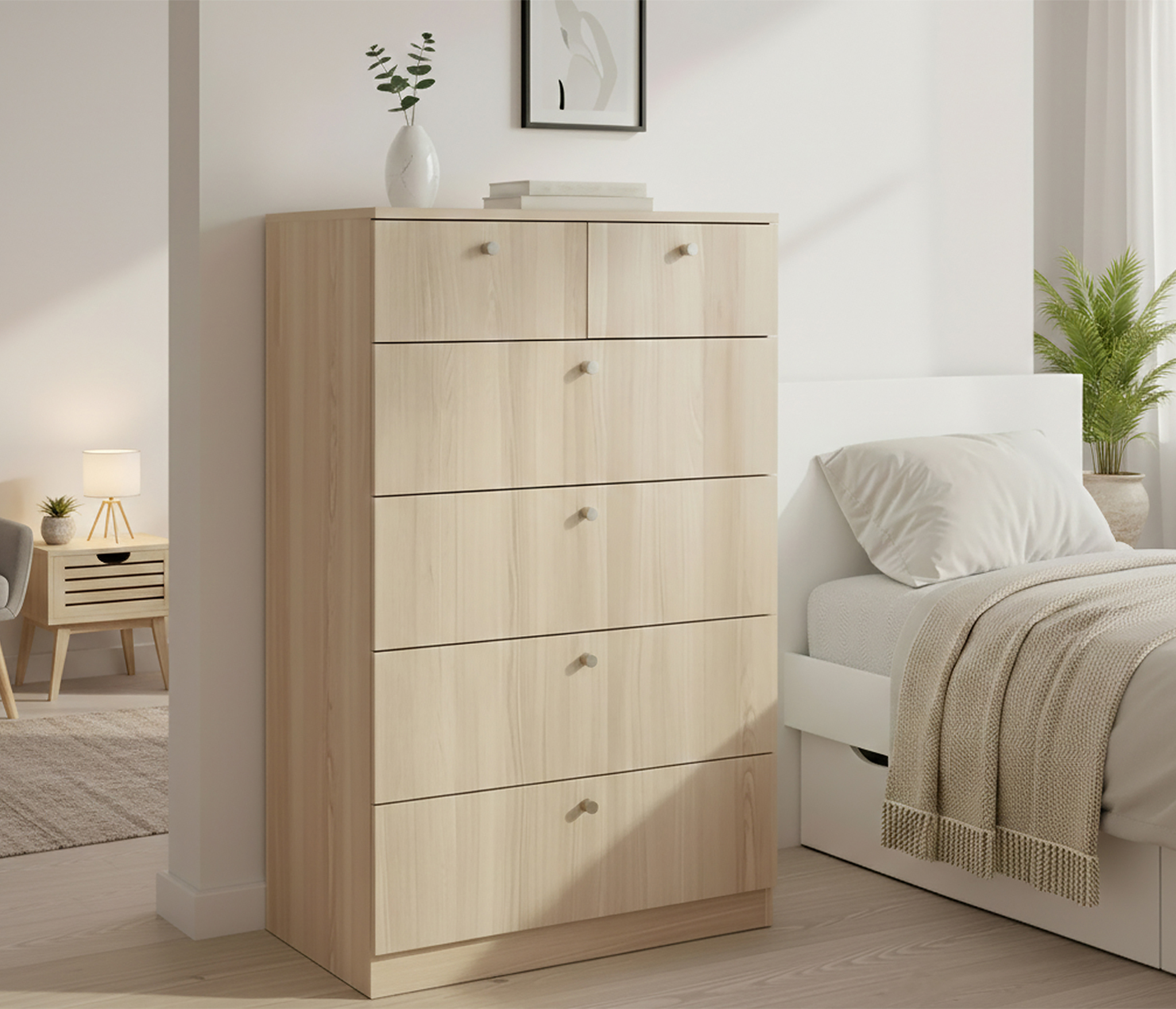 Корпус изготовлен из ЛДСП, устойчивой к повседневным нагрузкам и простой в уходе. Компактная глубина делает комод удобным для размещения в спальне, гостиной, детской или прихожей, не перегружая пространство.