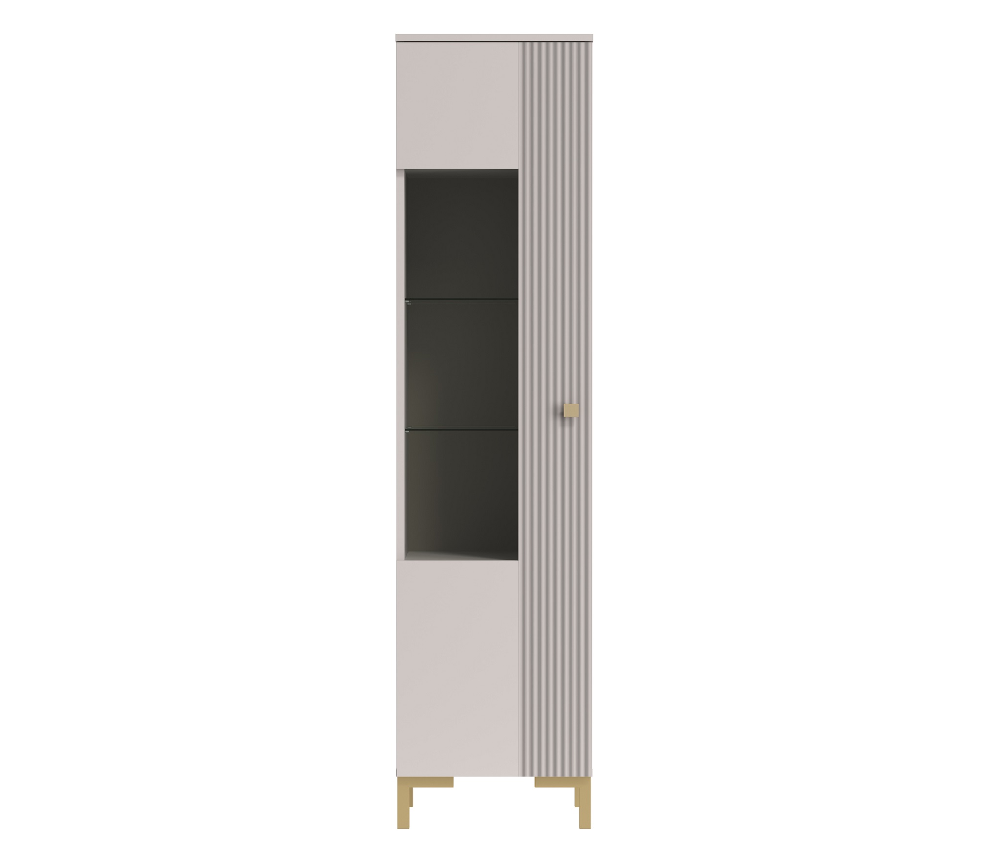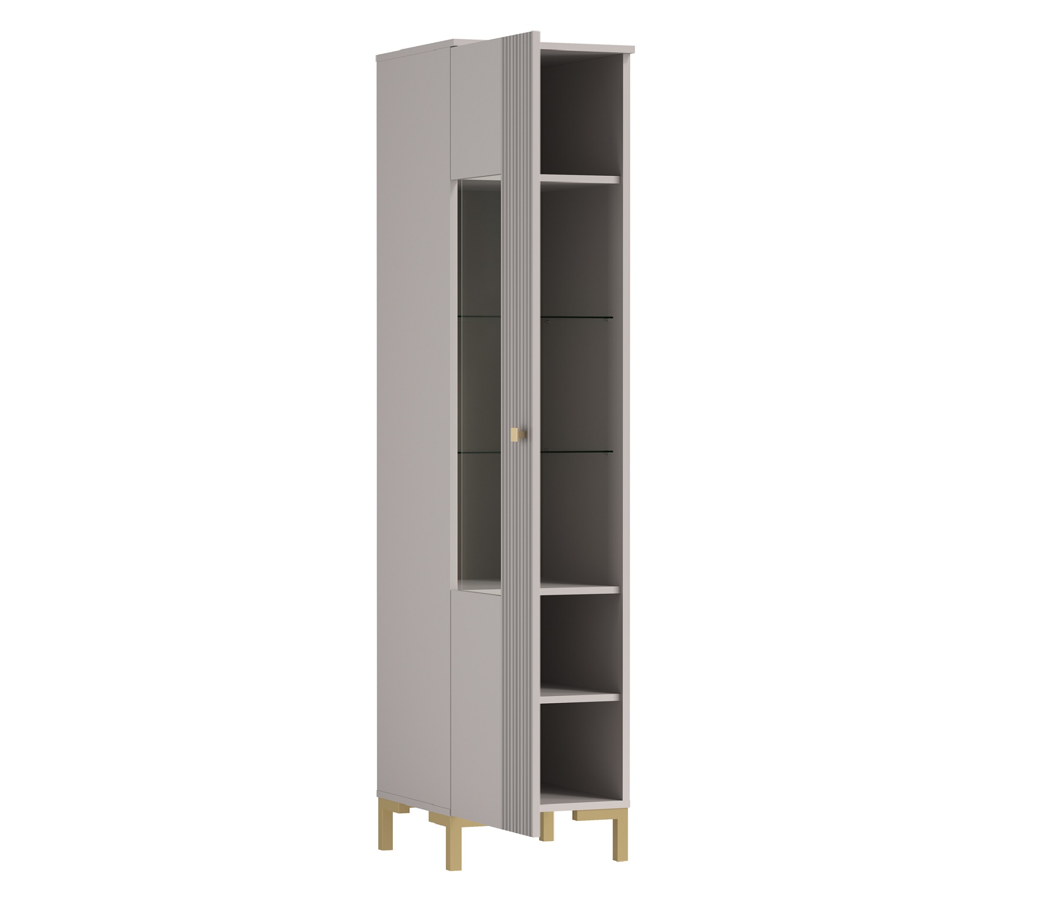 Внутри шкаф оборудован ЛДСП полками и стеклянными полками в зоне витрины.