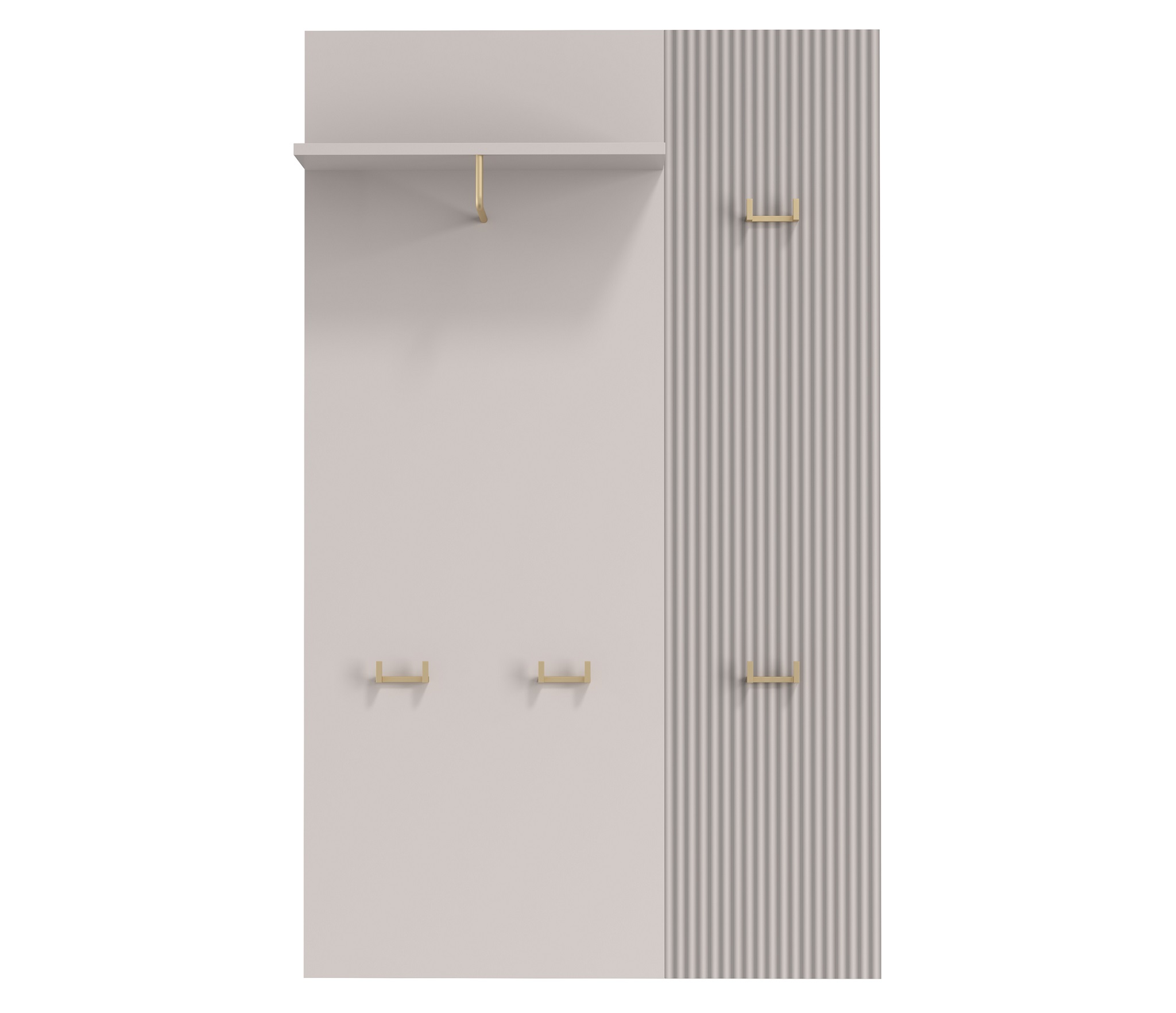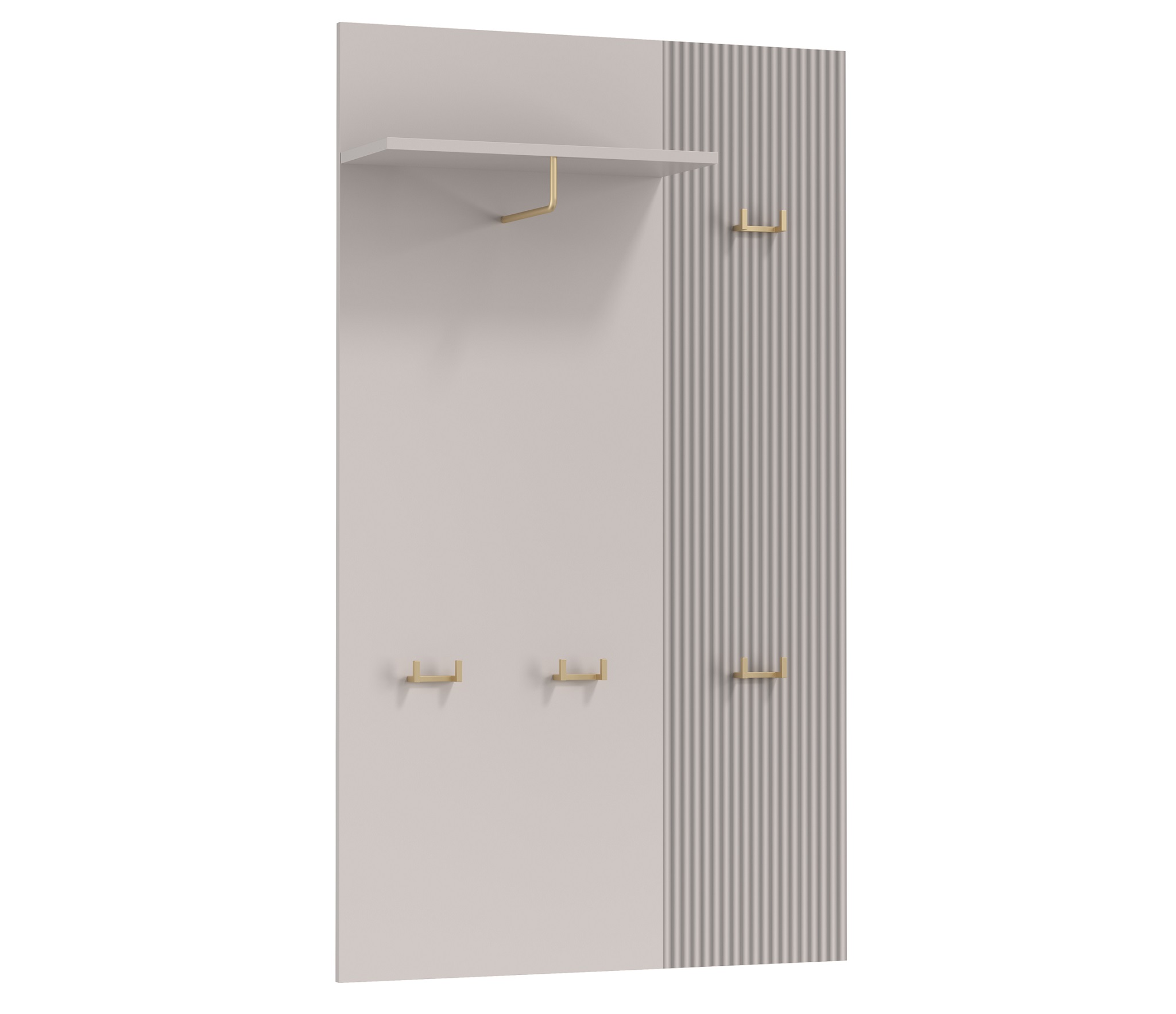 Вешалка в виде настенной панели с полкой под головные уборы, штангой и крючками для одежды и аксессуары.