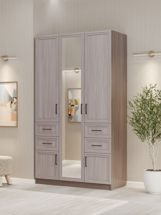 - Вместительность. Сочетание двух штанг, семи полок и четырёх ящиков позволяет удобно разместить значительный объём одежды, белья и бытовых предметов, поддерживая порядок в помещении.