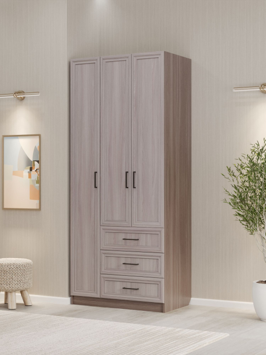 Шкаф имеет габариты: ширина — 90 см, глубина — 52 см, высота — 210 см. Фасады изготовлены из МДФ, корпус — из ЛДСП. Конструкция предусматривает трёхдверное исполнение. Внутри расположена горизонтальная штанга для белья, допустимая нагрузка на которую составляет до 10 кг. Также в шкафу предусмотрены 6 полок для размещения вещей, коробок или иных предметов и 3 выдвижных ящика для хранения мелких вещей и аксессуаров.