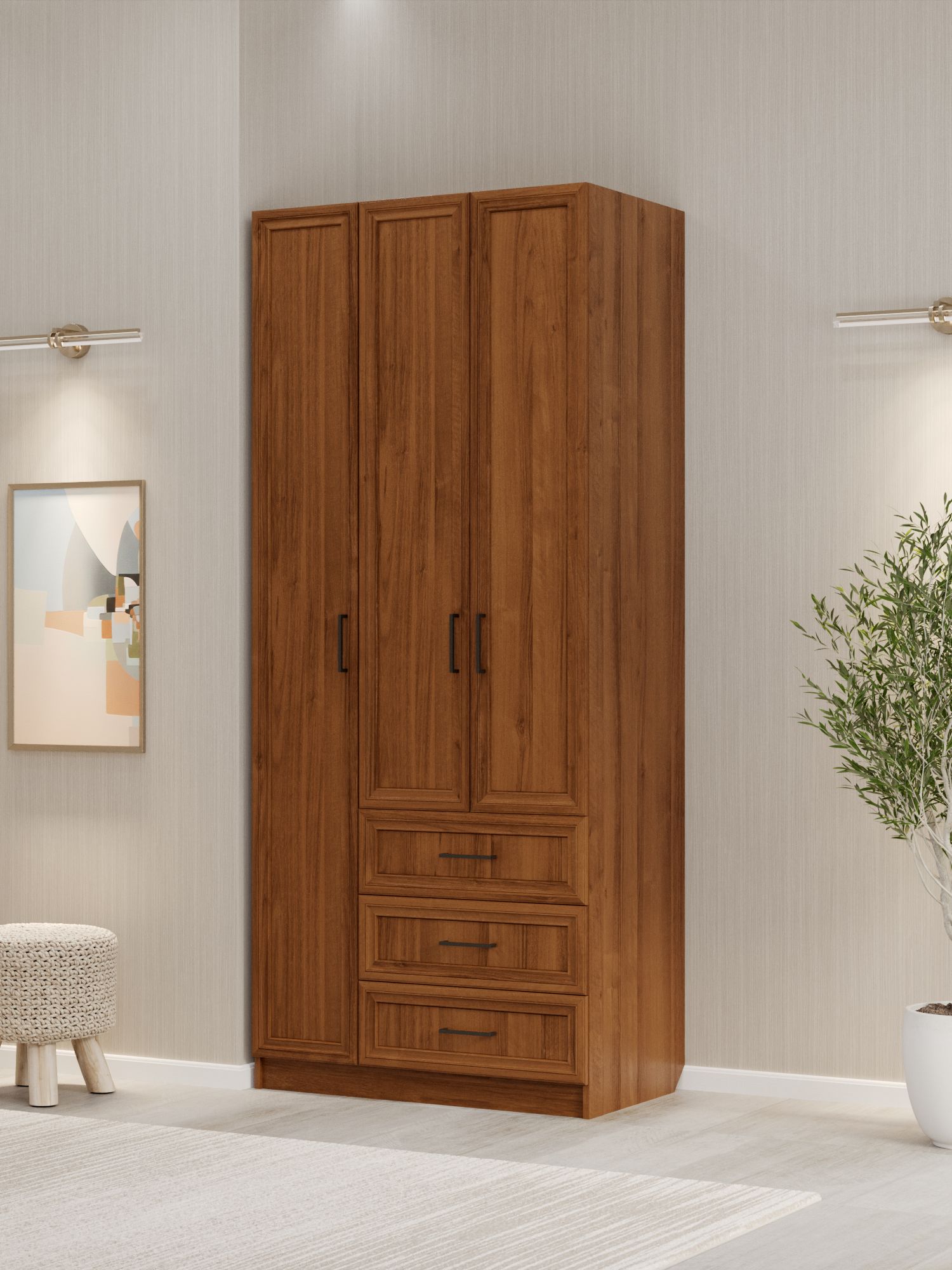 - Вместительность. Сочетание штанги, шести полок и трёх ящиков позволяет удобно разместить значительный объём одежды, белья и бытовых предметов, поддерживая порядок в помещении.