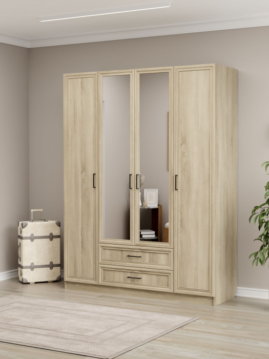 Шкаф имеет габариты: ширина — 160 см, глубина — 52 см, высота — 210 см. Фасады выполнены из МДФ, корпус изготовлен из ЛДСП. Конструкция предусматривает четырёхстворчатое исполнение. Внутри расположено отделение с горизонтальной штангой для белья, допустимая нагрузка на которую составляет до 10 кг. Также в шкафу предусмотрены 11 полок для размещения вещей, коробок или иных предметов.