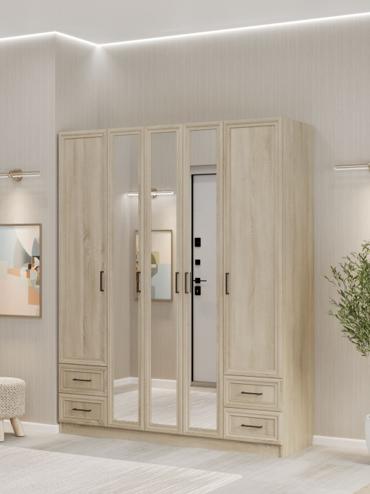 Шкаф имеет габариты: ширина — 170 см, глубина — 52 см, высота — 210 см. Фасады изготовлены из МДФ, корпус — из ЛДСП. Конструкция предусматривает пятидверное исполнение. Внутри размещены две горизонтальные штанги для белья, допустимая нагрузка на каждую из которых составляет до 10 кг. Также в шкафу предусмотрены 14 полок для размещения вещей, коробок или иных предметов и 4 выдвижных ящика для хранения мелких вещей и аксессуаров.