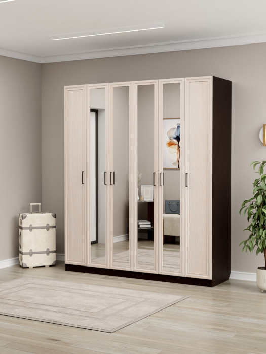 Шкаф имеет габариты: ширина — 180 см, глубина — 52 см, высота — 210 см. Фасады выполнены из МДФ, корпус изготовлен из ЛДСП. Конструкция предусматривает шестистворчатое исполнение. Внутри расположено отделение с горизонтальной штангой для белья, допустимая нагрузка на которую составляет до 10 кг. Также в шкафу предусмотрены 16 полок для размещения вещей, коробок или иных предметов.