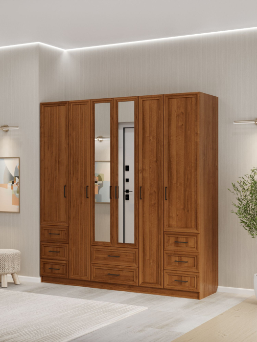 - Удобное зонирование. Шесть дверей позволяют чётко разграничить секции хранения, обеспечивая быстрый доступ к нужным вещам и повышая комфорт эксплуатации шкафа.
