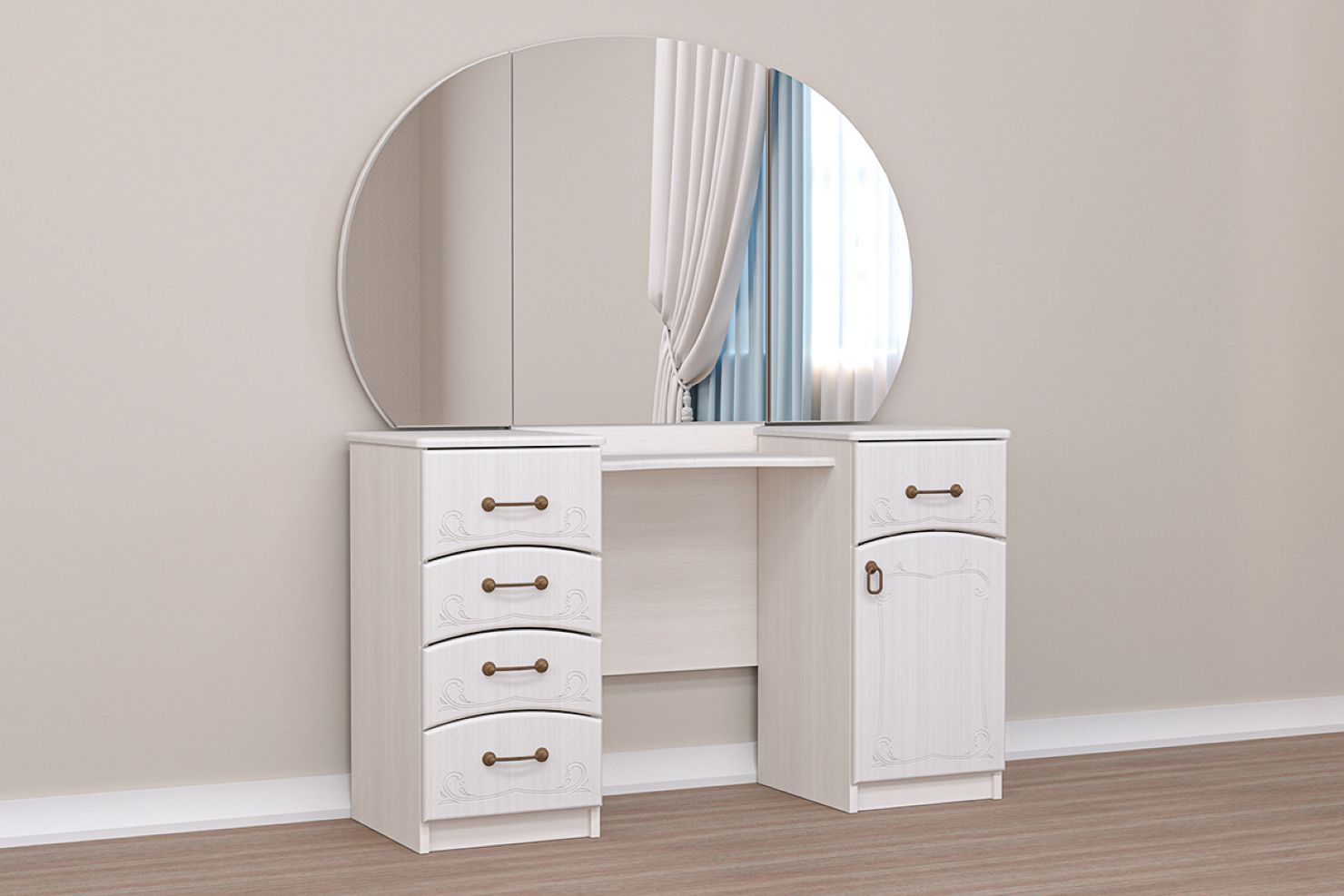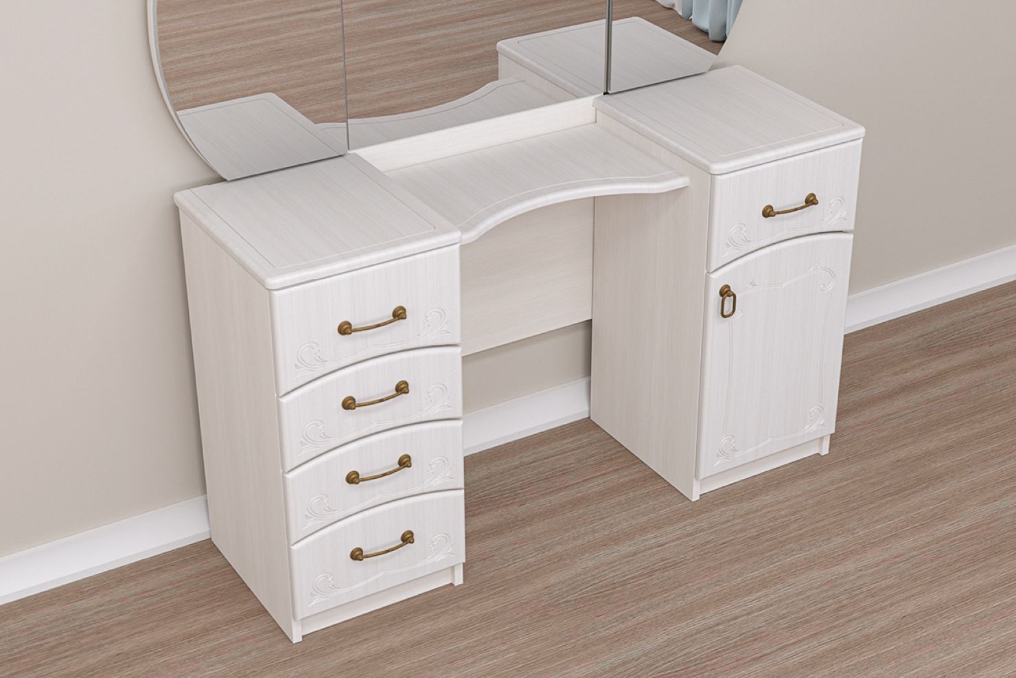 Цветовая гамма туалетного столика с зеркалом нейтральная, декора минимум,