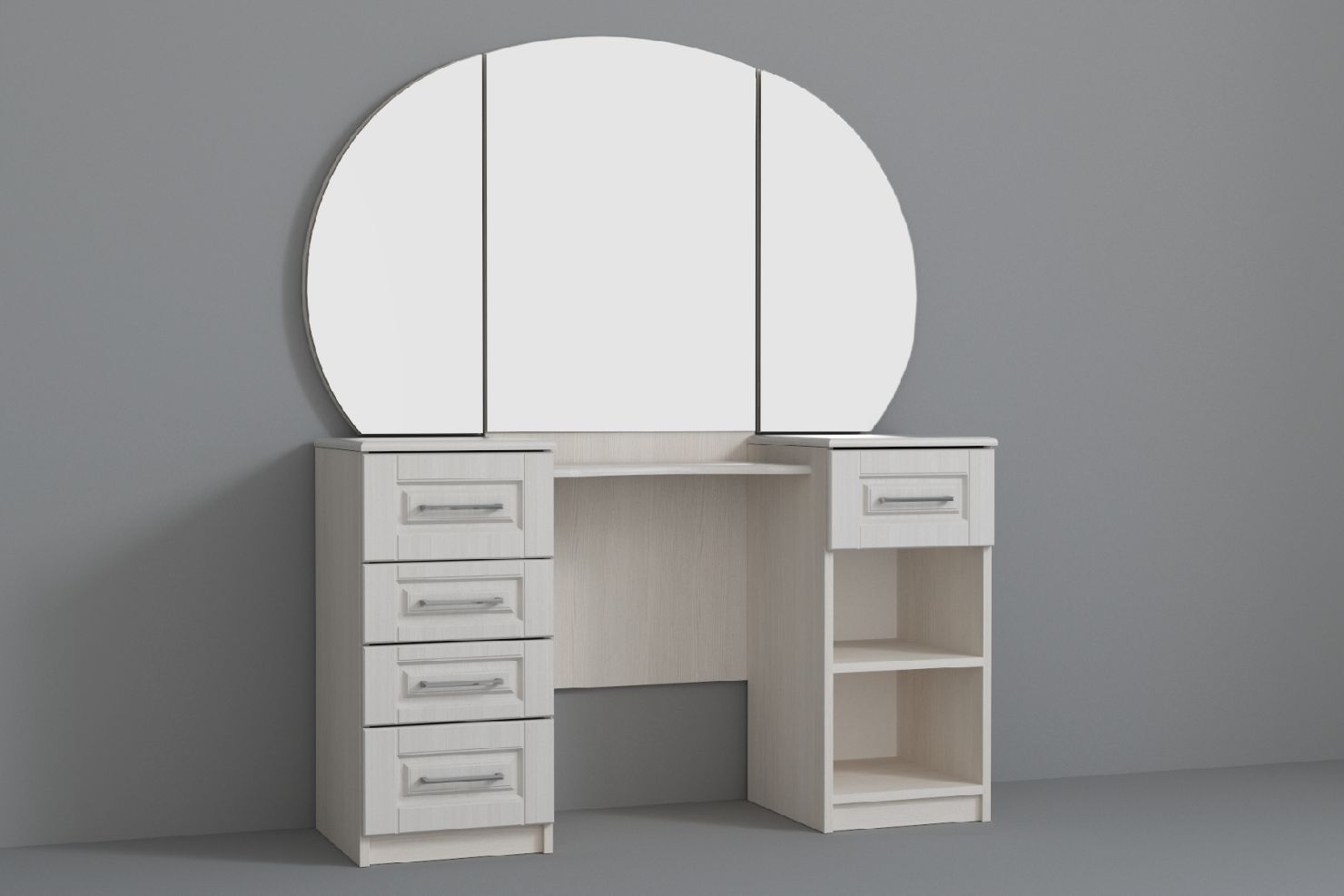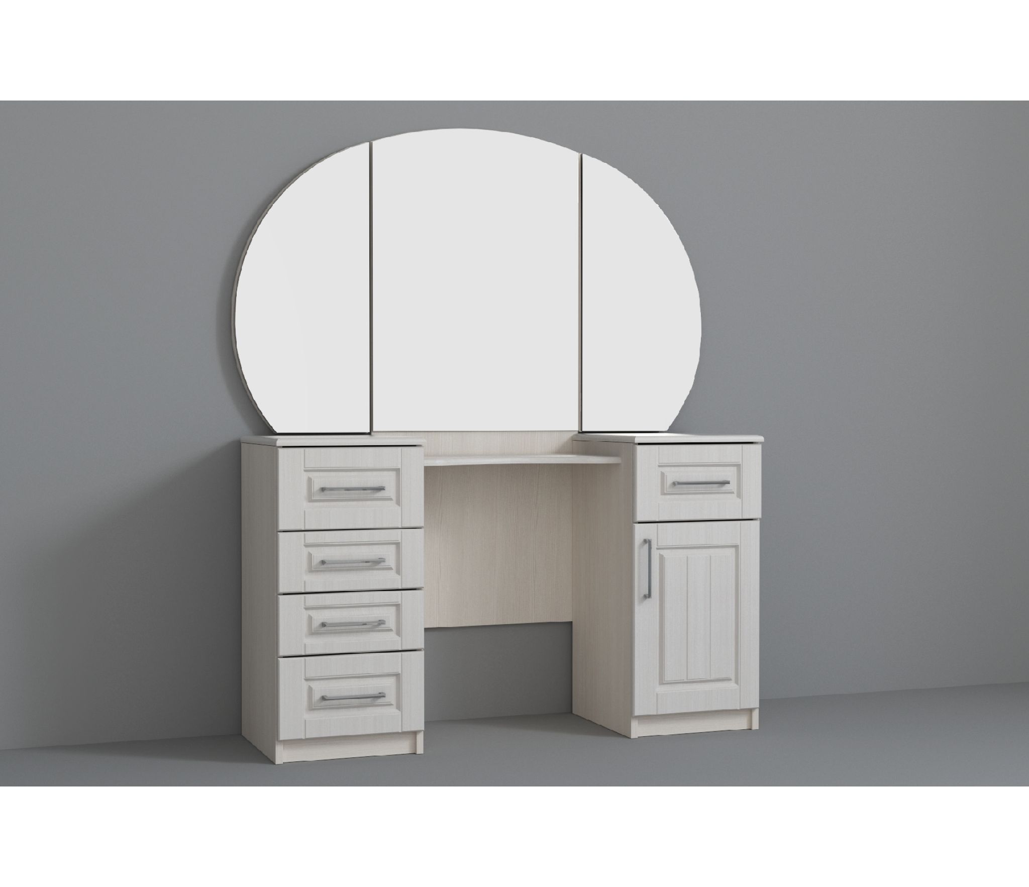 Цветовая гамма туалетного столика с зеркалом нейтральная, декора минимум,