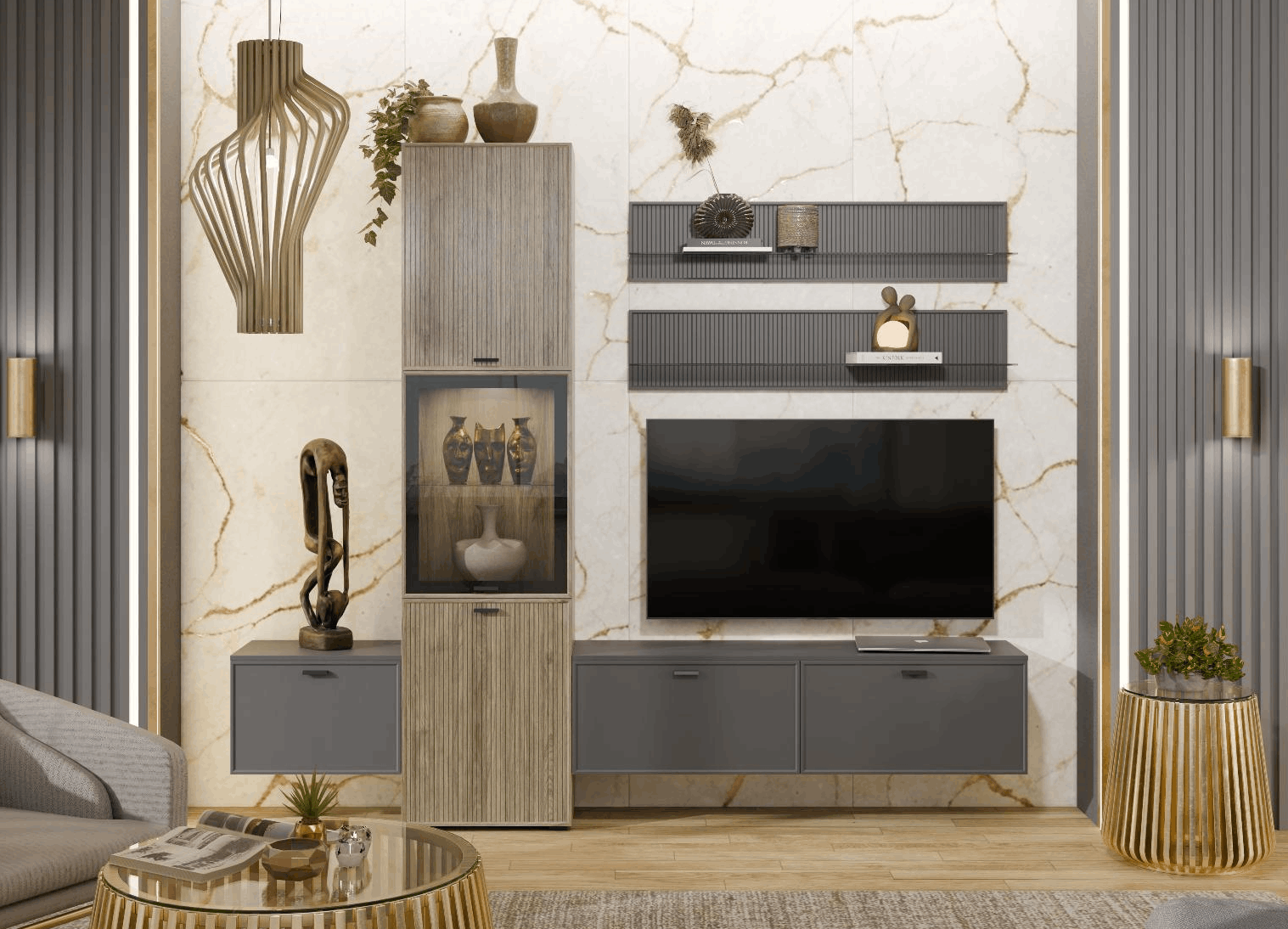 Отзывы о Столплит Модульная гостиная Стелла композиция 3 Серый Оникс Ребристый/Гикори Светлый Ребристый