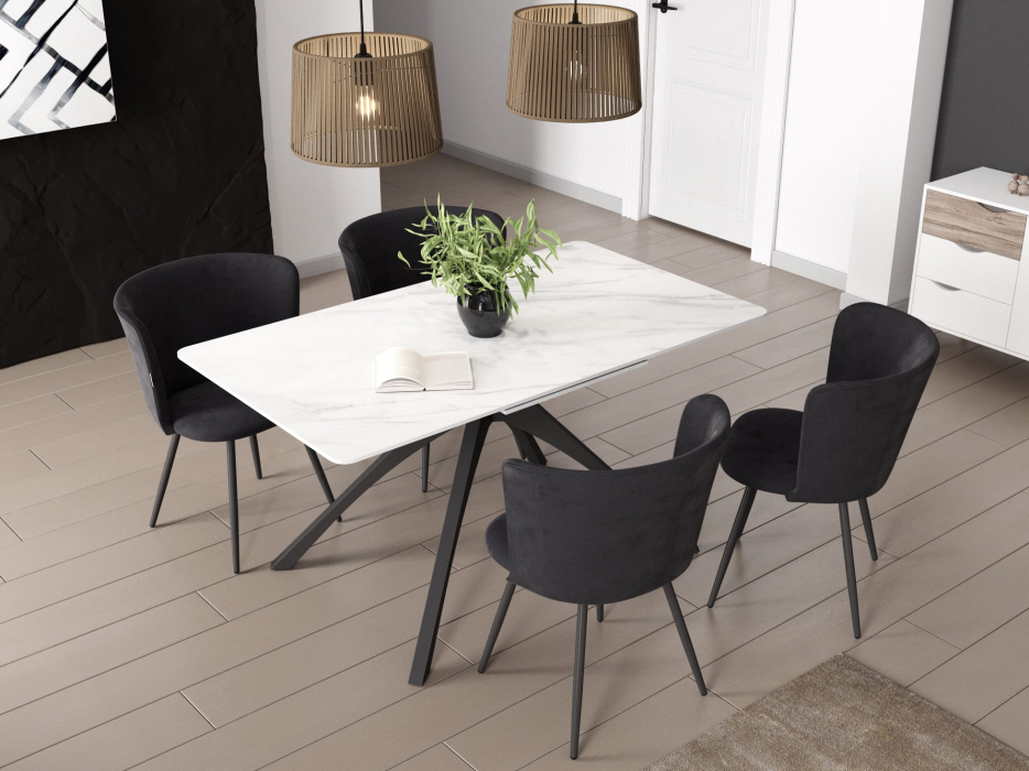 Стулья, в свою очередь, прекрасно дополняют обеденную группу и делают её визуально воздушной за счёт