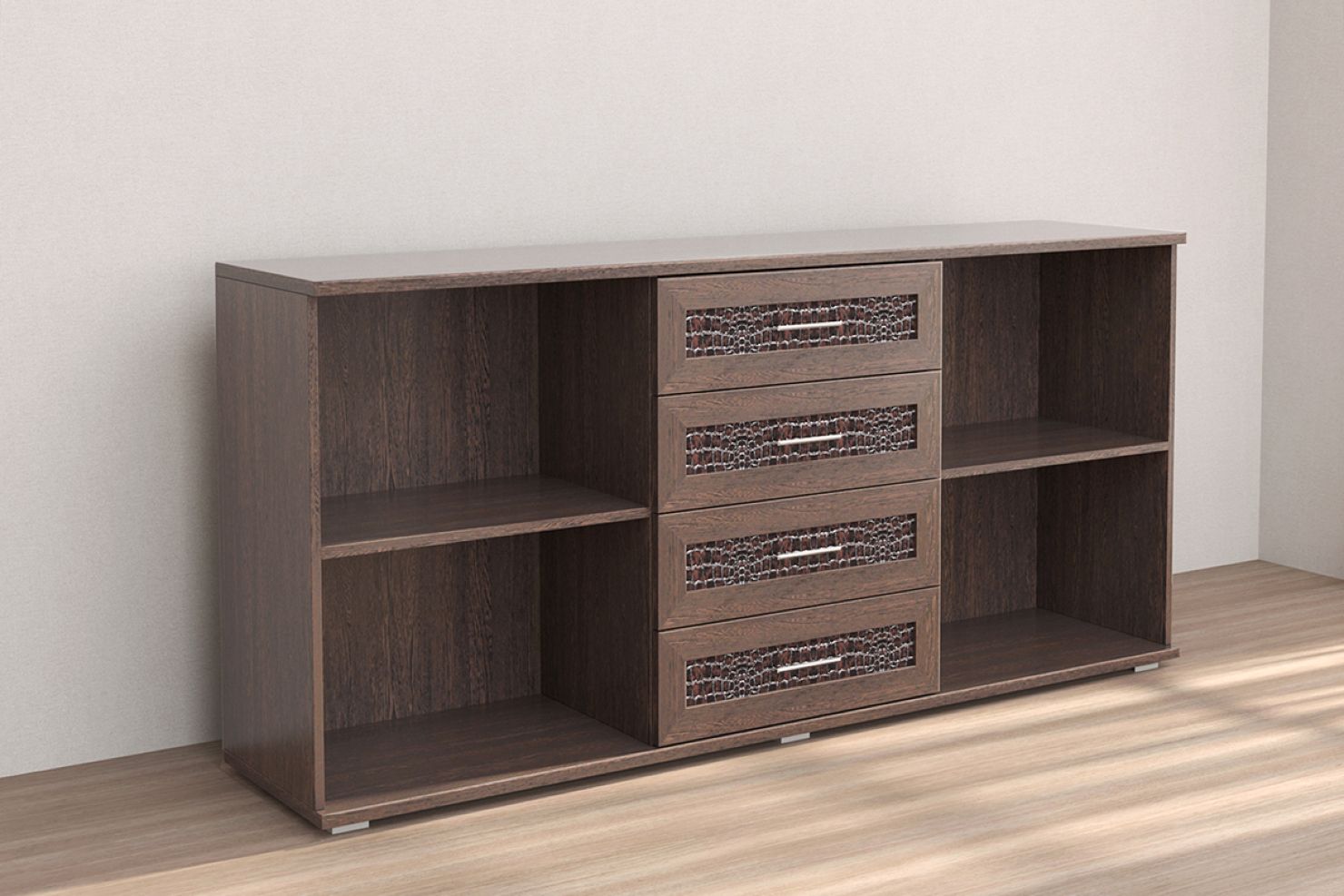 Благодаря наличию выдвижных ящиков и вместительных ниш в нём можно