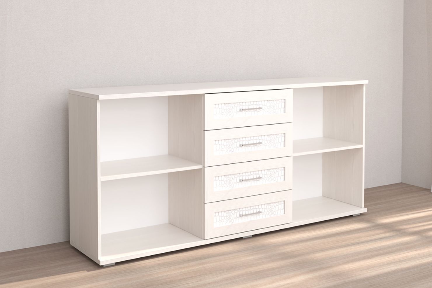 Благодаря наличию выдвижных ящиков и вместительных ниш в нём можно