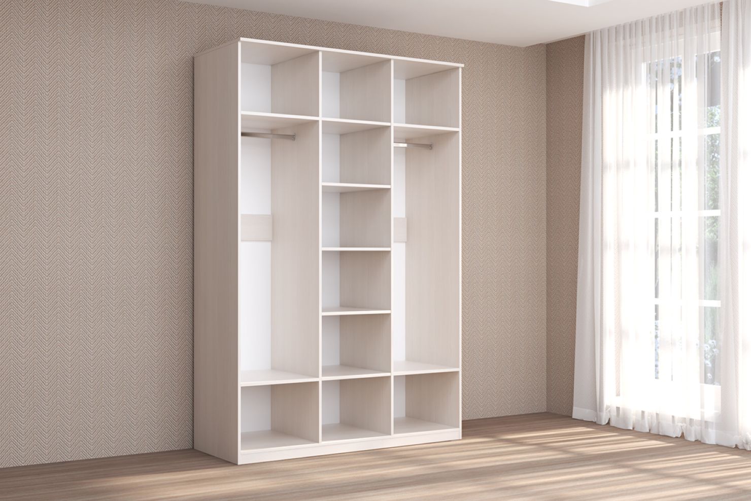 две крайние - с двумя полками и металлической штангой для одежды.
