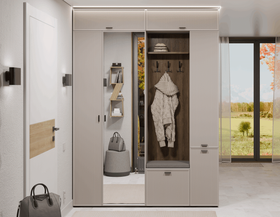 Прихожие СТЕЛЛА воплощают в себе актуальные тенденции мировой мебельной моды и позволяют создавать функциональные интерьеры в современном стиле, обеспечивающие высокий уровень комфорта. Сочетание нейтральных фоновых цветов и акцентных текстур дерева дают возможность открыть новые грани интерьера. Возможность использования различных вариантов вставки — дополнительное преимущество при планировании прихожей.
