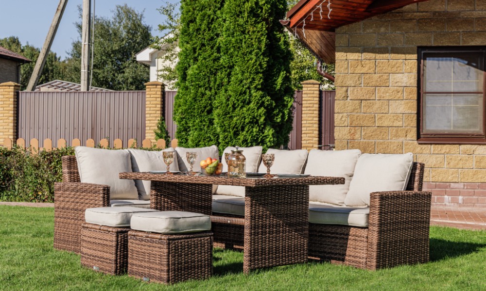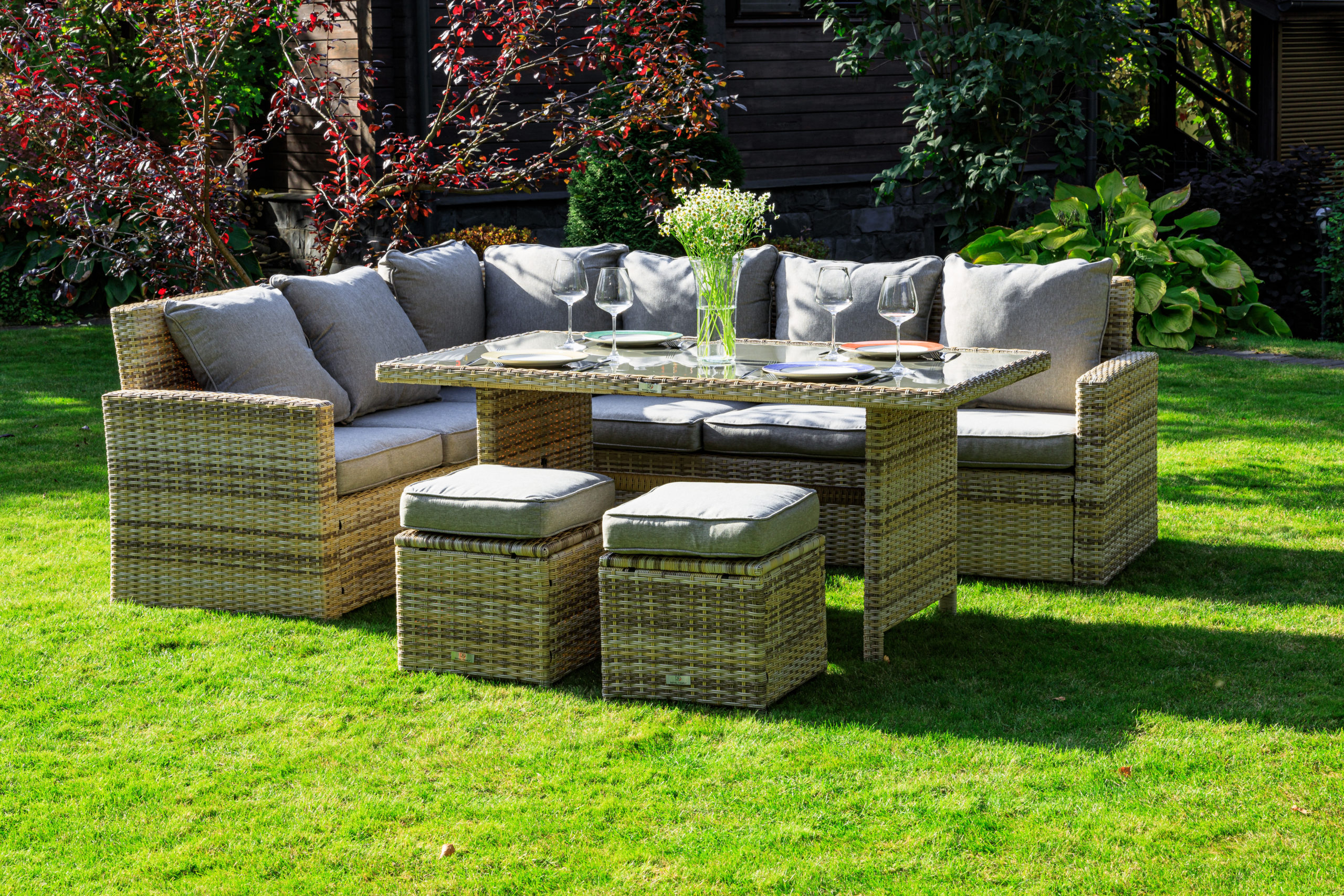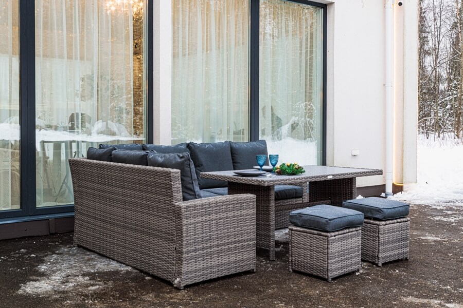 Премиальная мебель ручной работы в каждую семью! Угловой комплект садовой мебели из искусственного ротанга станет отличным решением для всех, кто отдает предпочтение летнему отдыху в тени приусадебного сада или на придомовой террасе. В набор входит все необходимое для организации полноценного уголка досуга даже для самой большой семьи. Комплект мебели ZORRO – лучший выбор для отдыха Вы состав набора садовой мебели входят: большой угловой диван, на котором без труда сможет разместиться 5-6 персон; два мягких пуфа; высокий обеденный стол со столешницей прямоугольной формы из закаленного стекла. Благодаря такой компоновке комплект подойдет не только для тихого семейного отдыха или вечерних совместных трапез, но и времяпровождения в кругу близких друзей. ZORRO – изысканность и практичность Набор уличной мебели изготовлен на основе прочного металлического каркаса с декоративной отделкой из плетеного ручным способом техноротанга. Благодаря натуральному серому оттенку он гармонично вписывается в любое окружение, не делая на себе лишних акцентов. Что касается эксплуатационных качеств садовой мебели ZORRO, то среди них стоит отметить: устойчивость к осадкам и солнечному свету; способность выдерживать высокие весовые нагрузки; стойкость к царапанию и прочему механическому воздействию; небольшой вес предметов для удобной переноски с места на место. Комплект дополнен мягкими подушками-сидениями с чехлами из водонепроницаемой ткани.