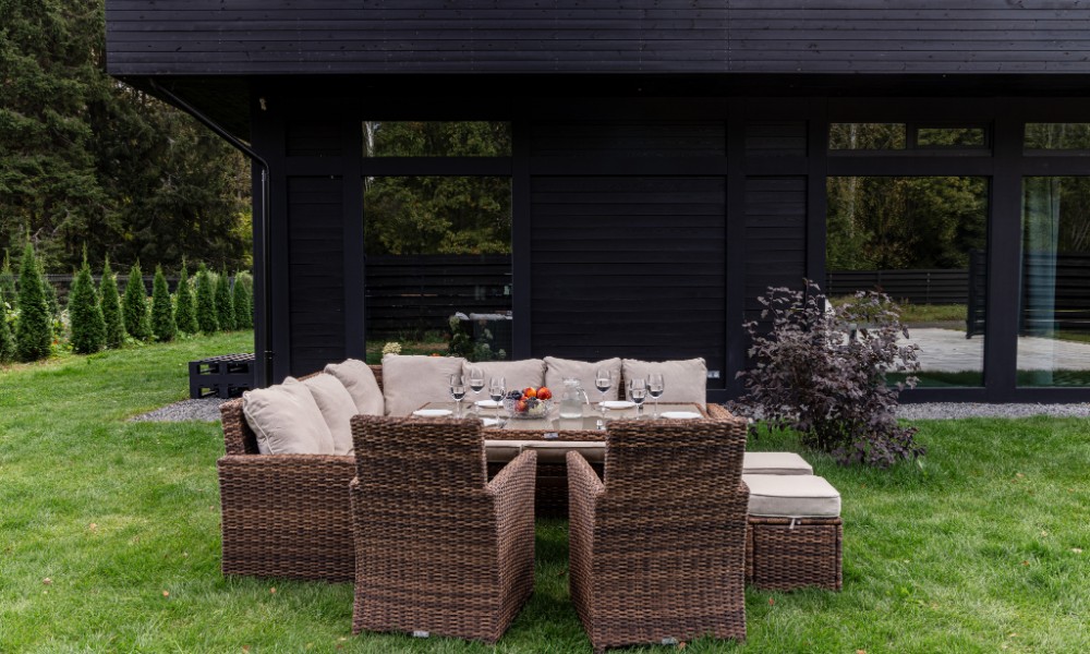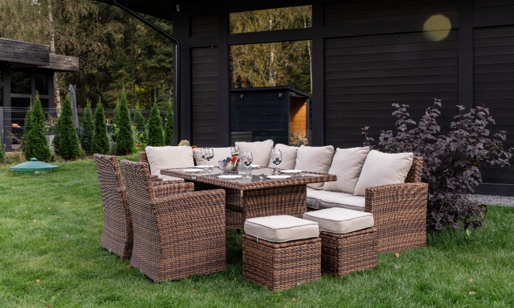Материал комплекта - искусственный ротанг (ручного плетения)