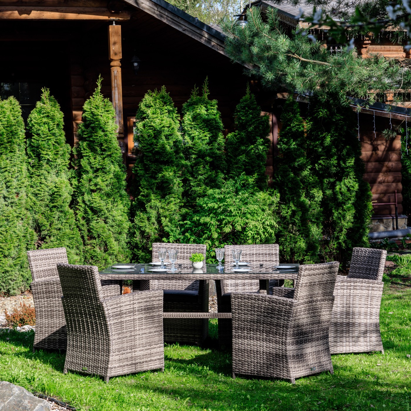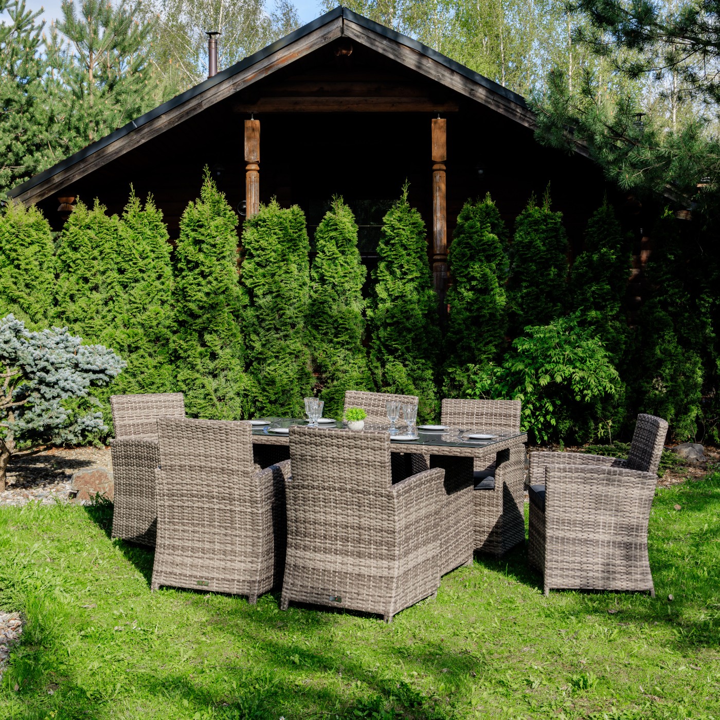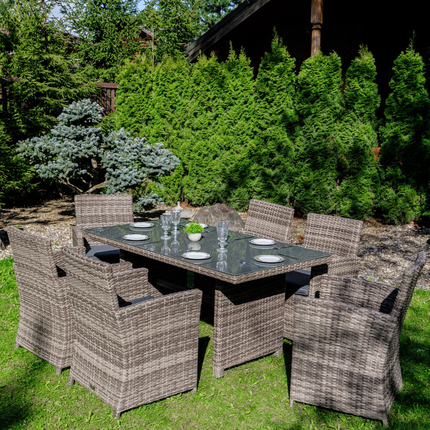 Премиальная мебель ручной работы в каждую семью! Обеденный комплект FIONA станет отличным решением для тех, кто предпочитает проводить летние вечера на улице в кругу друзей и семьи! Его габаритов вполне достаточно не только для ежедневных семейных трапез на свежем воздухе, но и праздничных застолий в больших компаниях. В основе каждого представленного в наборе предмета лежит прочный алюминиевый каркас, способный выдерживать высокие весовые и другие механические нагрузки без риска деформации и расшатывания. Алюминий не подвержен коррозии, благодаря чему мебель прослужит долго. В качестве декоративной отделки использовано плотное плетение из искусственного ротанга серого цвета – современного синтетического материала, который: точно имитирует фактуру натуральной тропической лианы; не подвержен гниению при контактах с водой; сохраняет свой цвет при постоянном активном воздействии солнечных лучей. Благодаря качественным и долговечным материалам обеденный комплект FIONA станет надежным спутником Вашей загородной жизни на долгие годы! В комплект входят: — 6 комфортабельных кресел с подлокотниками, высокими спинками и мягкими подушками; — большой обеденный стол со столешницей из закаленного стекла. Съемные чехлы для подушек серого цвета изготовлены из водоотталкивающей ткани, которая не подвержена изменению от погодных условий. Сдержанный современный дизайн и использование нейтральных серых оттенков — преимущества комплекта. Этот набор садовой мебели будет гармонично смотреться в любом окружении. Он подходит для установки на террасе или веранде, в летней беседке или под открытым небом на Вашем участке.