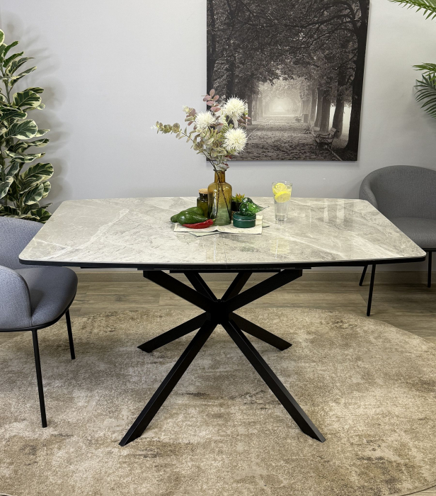 Кухонный раздвижной прямоугольный керамический обеденный стол для кухни и дома KENNER BR1400 в черном цвете с керамической столешницей GLORIA WHITE. Современный раскладной стол удобен для ежедневного использования и легко раскладывается. Центральная опора обеспечивает устойчивость и комфортную посадку, а прочная керамика гарантирует долговечность и аккуратный премиальный внешний вид.