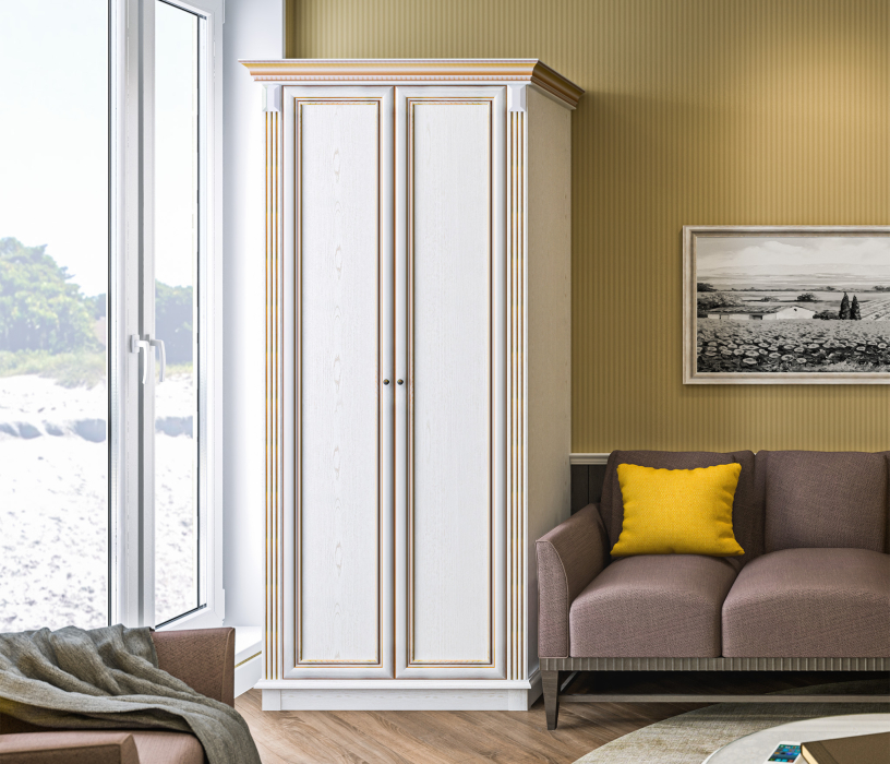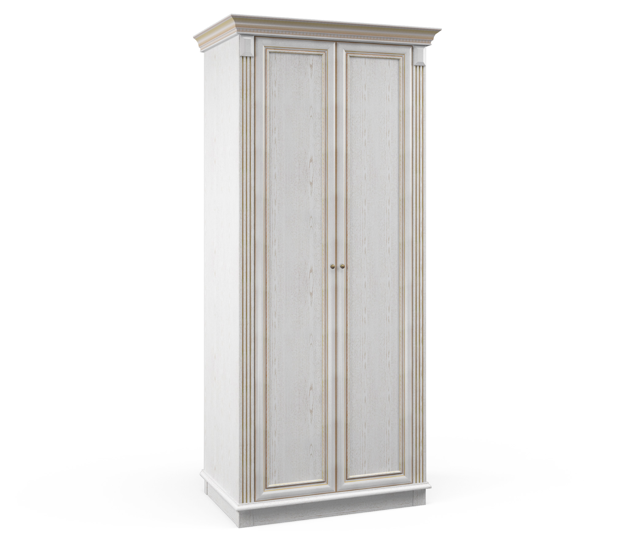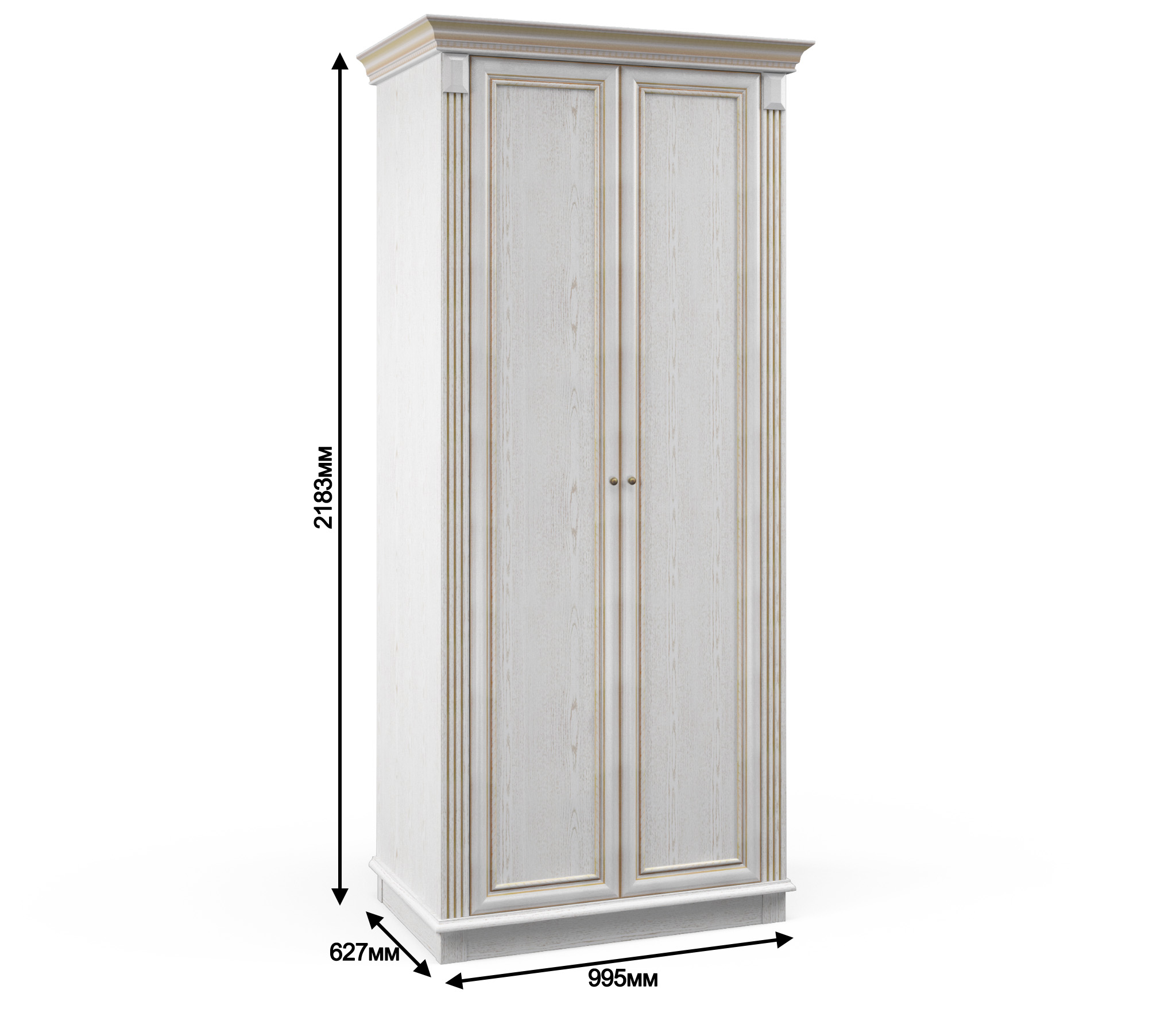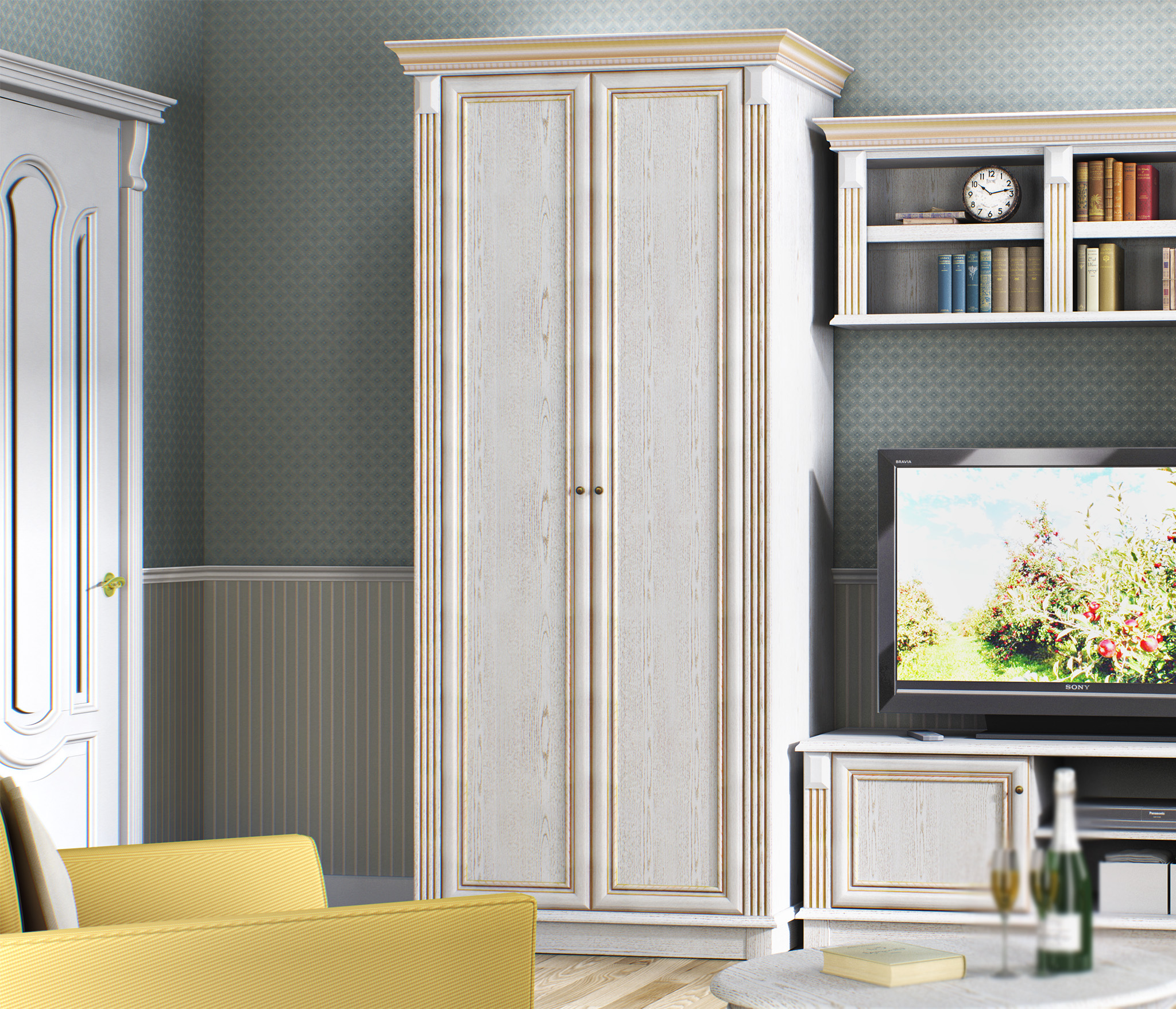 Габаритные размеры шкафа далеки от компактных – ширина 99 см, высота 218 см и глубина 62 см. Шкаф имеет одно вместительное отделение со штангой для аккуратного развешивания верхней одежды и верхнюю антресоль. Изделие имеет сдержанный благородный дизайн и является элементом модульной коллекции Версаль. Корпус шкафа выполнен из КДСП, фасады - из МДФ. Светлый оттенок «Белый ясень» и стильные декоративные элементы - карниз-корона и пилястры - придают шик и винтажность данной модели.