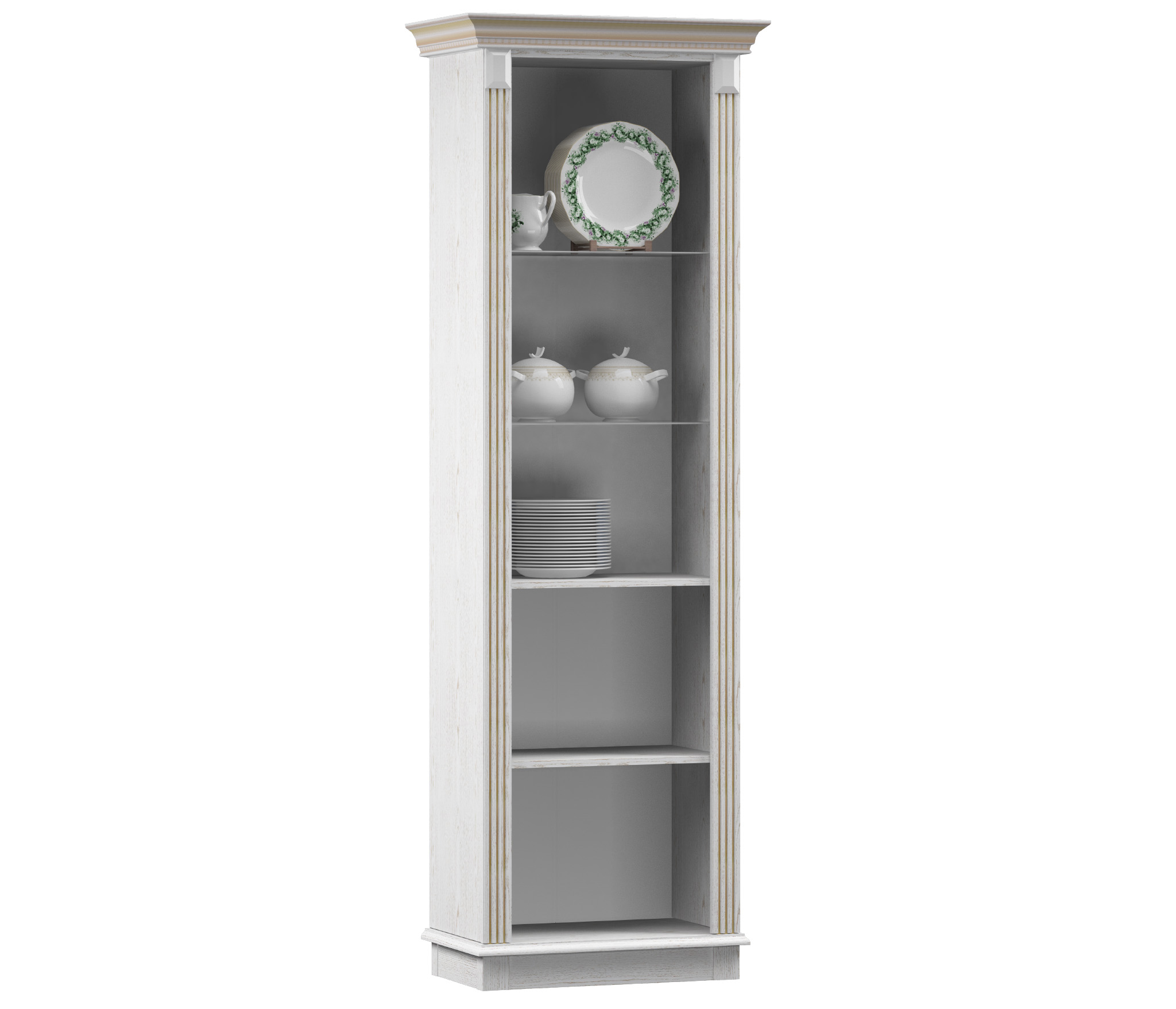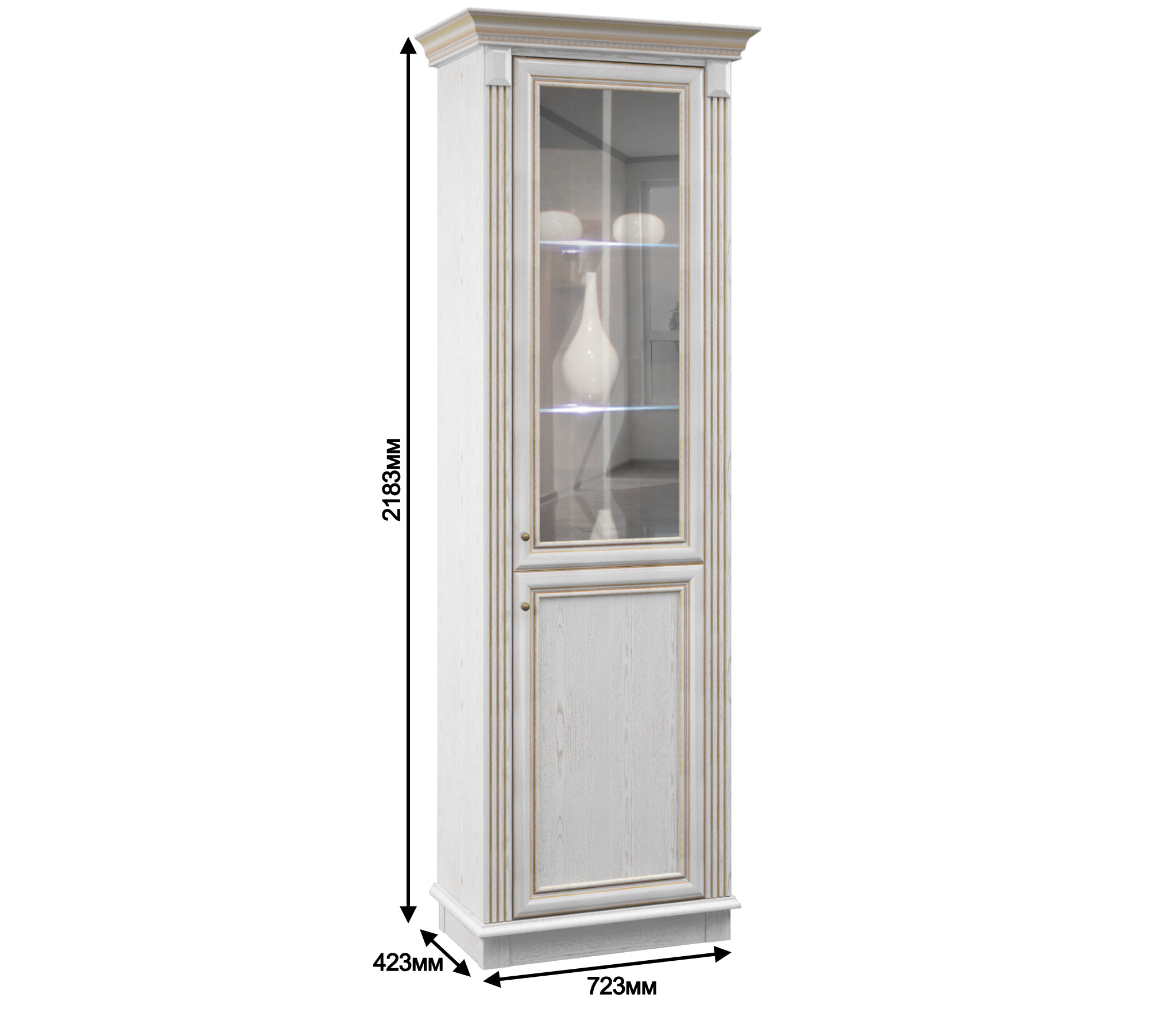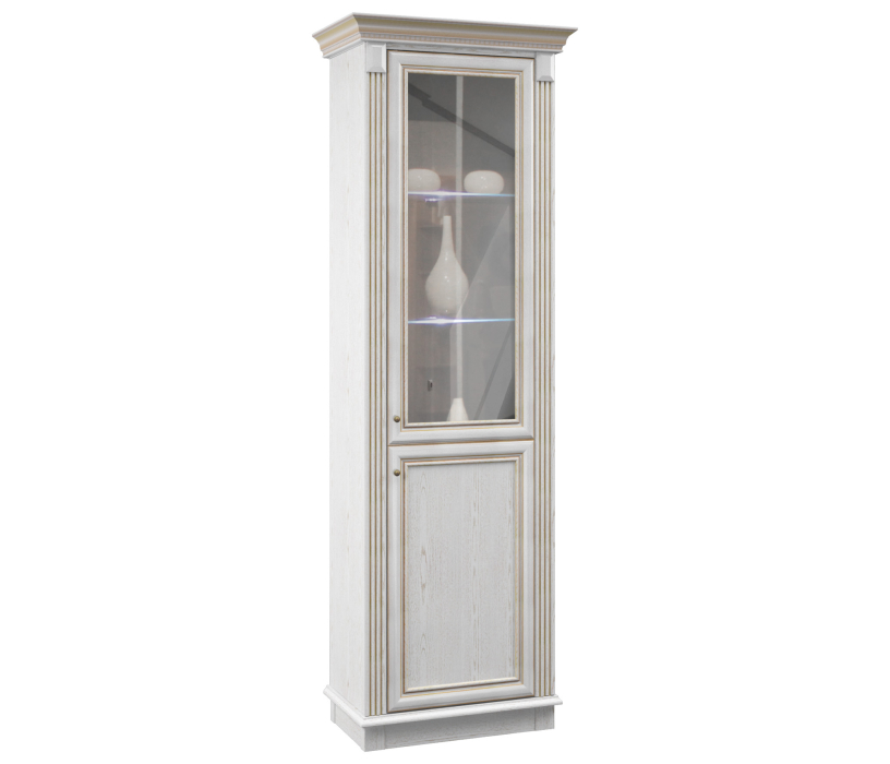 Корпус витрины выполнен из современного и прочного КДСП в цвете «Белый Ясень», рамочные фасады выполнены из МДФ, с золотистой патиной и круглыми металлическими ручками.