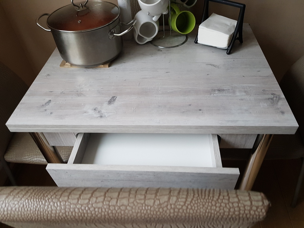 Очень понравилось то, что в столе есть ящик, очень удобно ставить туда кухонные приборы.
