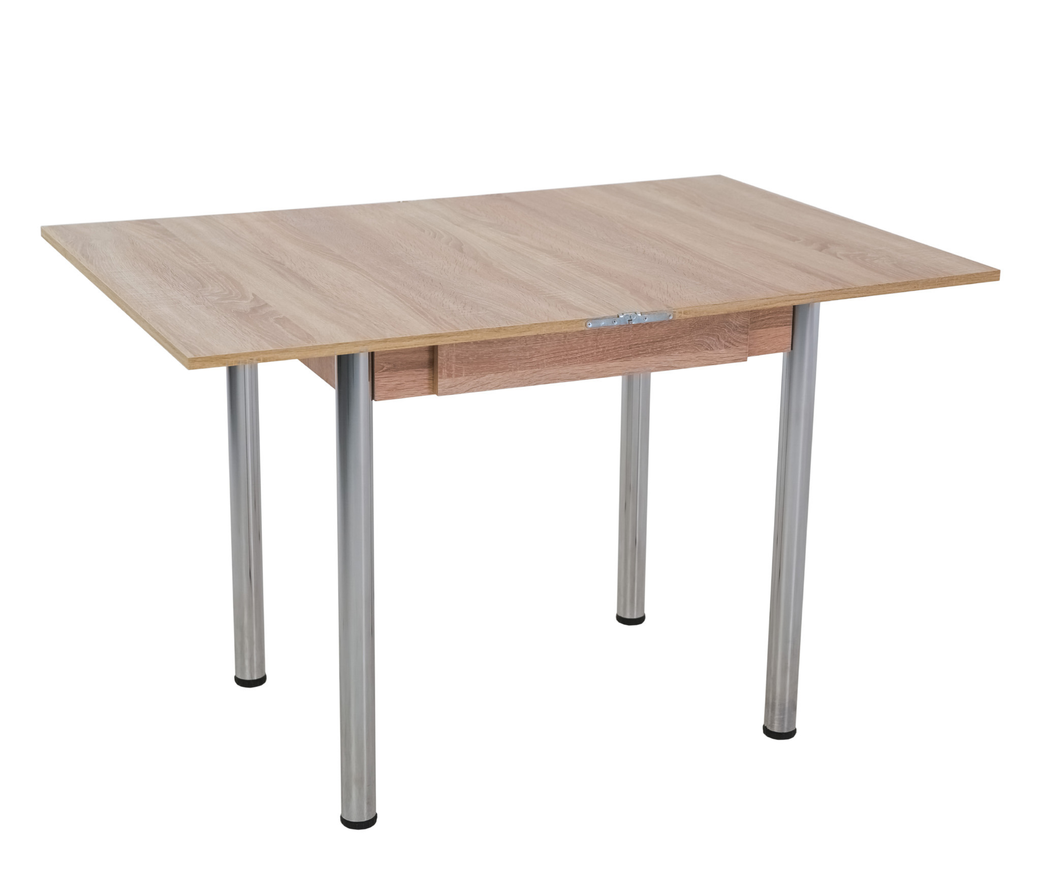 Стол обеденный раскладной с ящиком изготовлен из ЛДСП на Хромированных ножках.,отичается простотой применения и сборки.Небольшой размер:60*80*750 в сложенном виде и 80*1200*750 в разложенном виде,позволяет разместить даже на самой маленькой кухне.