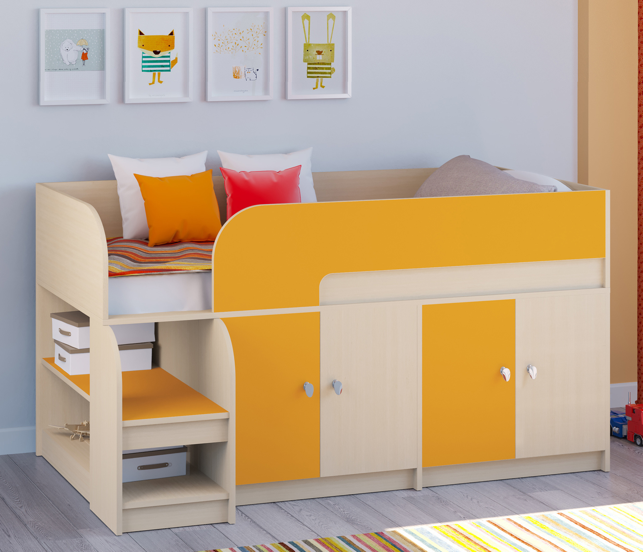 Кровать-чердак Астра 9 превосходно подойдет для детей раннего возраста. Компактная конструкция кровати позволяет сэкономить место в комнате и в то же время хранить массу необходимых вещей. Два вместительных шкафчика позволят разместить в своих недрах детскую одежду, книги, игрушки и другие столь необходимые для ребенка вещи. На двух больших полках, переходящих в лестницу, ребенок может "выставлять напоказ" свои игрушки или творческие поделки.