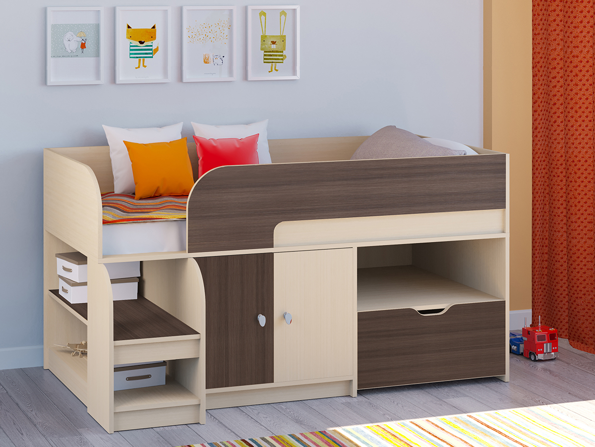 Кровать-чердак Астра 9 превосходно подойдет для детей раннего возраста. Компактная конструкция кровати позволяет сэкономить место в комнате и в то же время хранить массу необходимых вещей. Вместительный шкафчик позволит разместить в своих недрах детскую одежду. На просторной полке можно разместить массу книг. А большой, глубокий ящик позволит хранить огромное количество детских игрушек. На двух больших полках, переходящих в лестницу, ребенок может "выставлять напоказ" свои игрушки или творческие поделки.