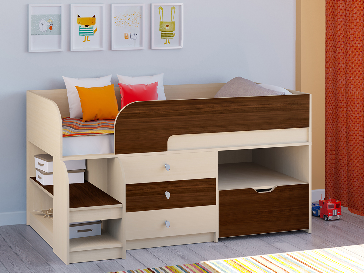Кровать-чердак Астра 9 превосходно подойдет для детей раннего возраста. Компактная конструкция кровати позволяет сэкономить место в комнате и в то же время хранить массу необходимых вещей. Три вместительных ящика подходят для хранения детских принадлежностей, одежды или книг. На просторной полке можно разместить массу книг. А большой, глубокий ящик позволит хранить огромное количество детских игрушек. На двух больших полках, переходящих в лестницу, ребенок может "выставлять напоказ" свои игрушки или творческие поделки.