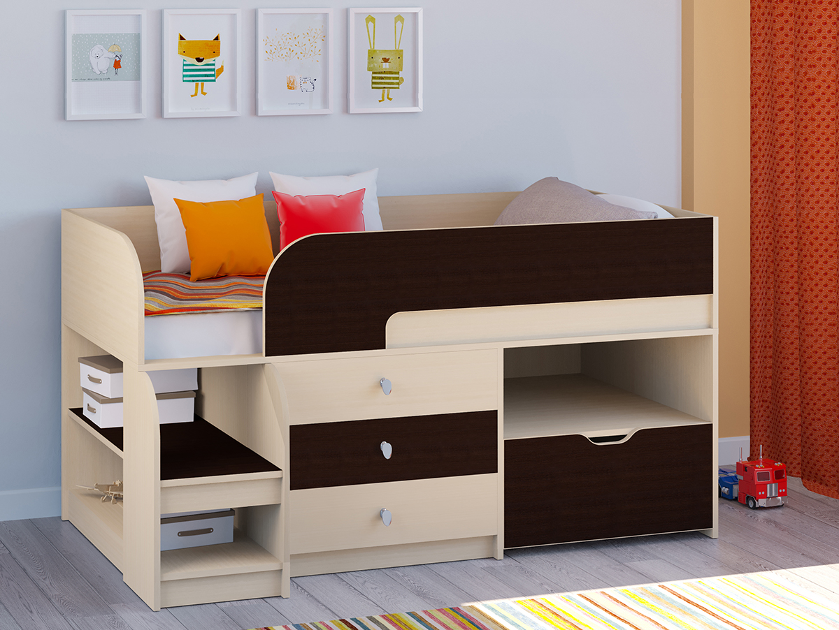 Кровать-чердак Астра 9 превосходно подойдет для детей раннего возраста. Компактная конструкция кровати позволяет сэкономить место в комнате и в то же время хранить массу необходимых вещей. Три вместительных ящика подходят для хранения детских принадлежностей, одежды или книг. На просторной полке можно разместить массу книг. А большой, глубокий ящик позволит хранить огромное количество детских игрушек. На двух больших полках, переходящих в лестницу, ребенок может "выставлять напоказ" свои игрушки или творческие поделки.