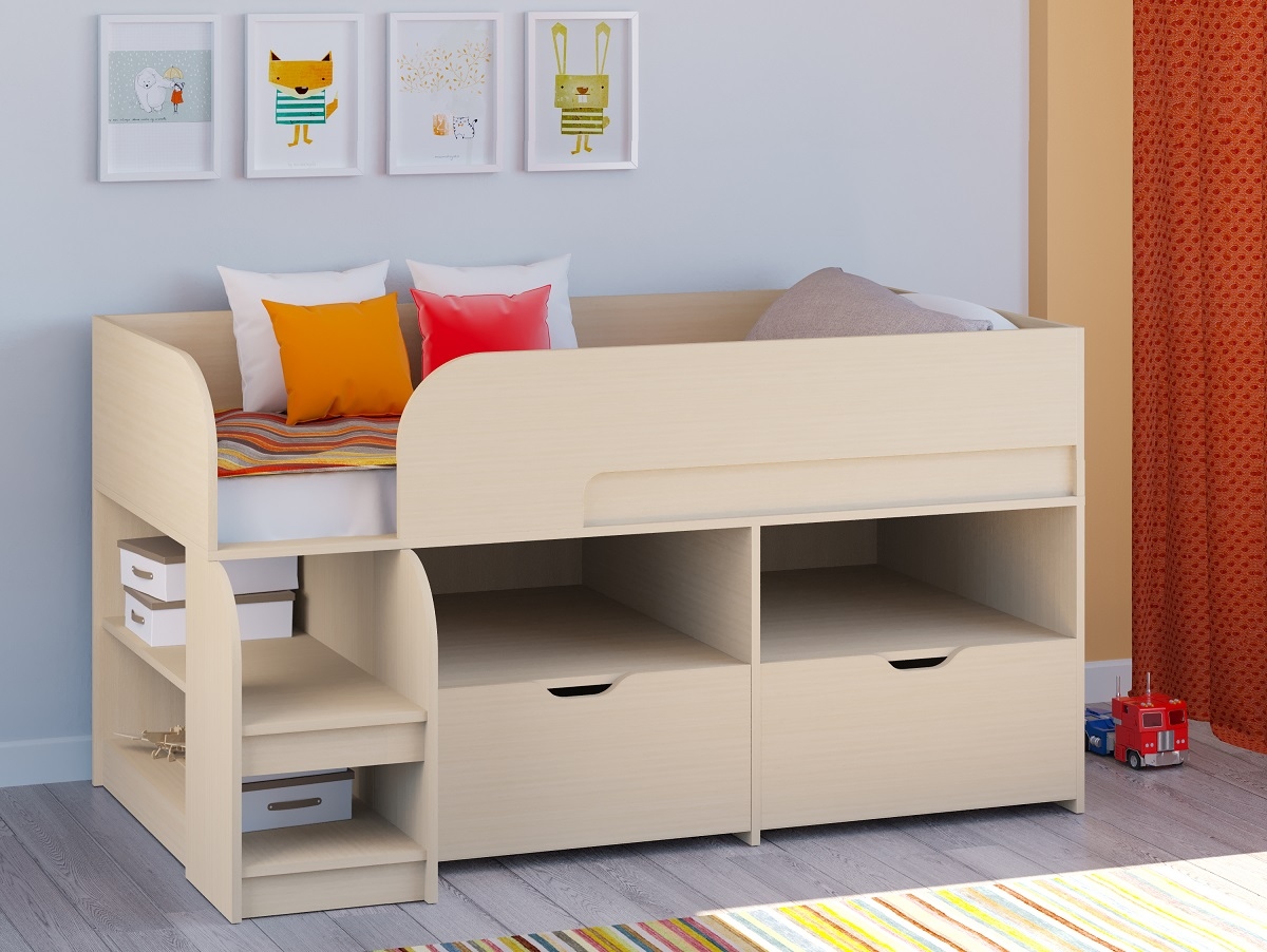 Кровать-чердак Астра 9 превосходно подойдет для детей раннего возраста. Компактная конструкция кровати позволяет сэкономить место в комнате и в то же время хранить массу необходимых вещей. На двух просторных полках можно разместить массу книг и детских принадлежностей. А два больших, глубоких ящика позволят хранить огромное количество детских игрушек. На двух больших полках, переходящих в лестницу, ребенок может "выставлять напоказ" свои игрушки или творческие поделки.