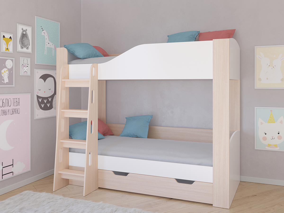 Кровать двухъярусная Астра 2 проста по своей конструкции, за счет чего может похвастаться высокой надежностью при низкой цене. Вместе с тем она обладает 2 полноценными спальными местами, удобной лестницей и двумя вместительными ящиками, позволяющими хранить в себе белье или же другие необходимые предметы.