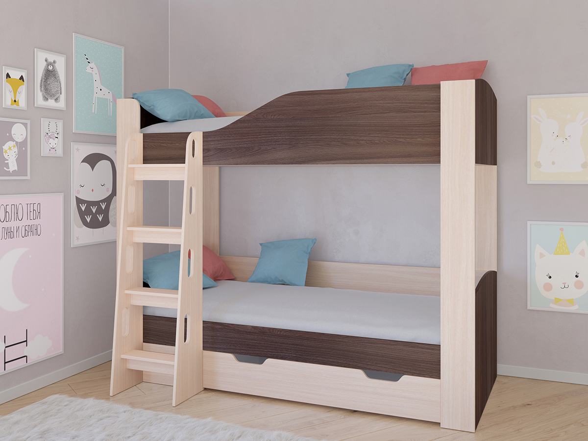 Кровать двухъярусная Астра 2 проста по своей конструкции, за счет чего может похвастаться высокой надежностью при низкой цене. Вместе с тем она обладает 2 полноценными спальными местами, удобной лестницей и двумя вместительными ящиками, позволяющими хранить в себе белье или же другие необходимые предметы.