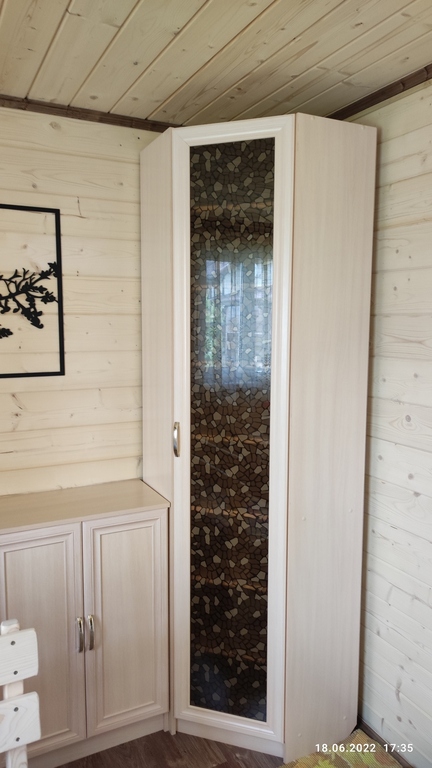 По размеру и по цвету идеально подошли три такие тумбочки с угловым шкафом на дачу. Исполнение не идеальное, домой не взяла бы, для дачи сойдет. Стекло оклеено отдельно купленной пленкой, от продавца стекло прозрачное коричневое.