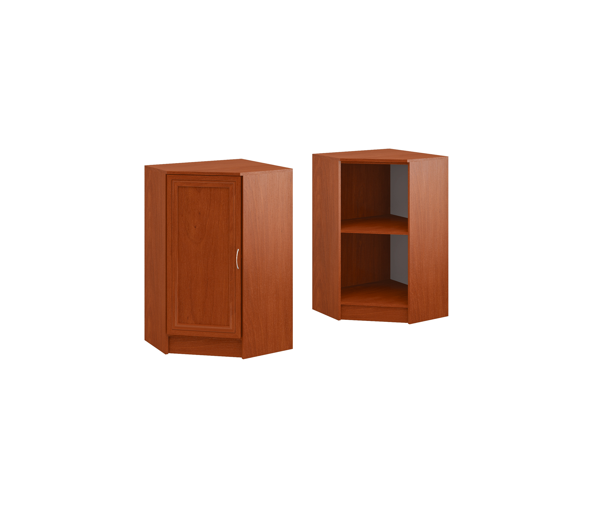 Тумба напольная угловая выполнена из Ламинированной ДСП высокого качества с насыщенным цветом. Фасады выполнены из материала МДФ.Изделие имеет 2 полки, что в совокупности дает 3 ниши, расположенных за распашной дверкой.Данный шкаф-тумба рассчитан для книг, учебных пособий, каталогов или медицинских карт. Отлично подойдет для учебных или мед учреждений, выставочной или торговой площади