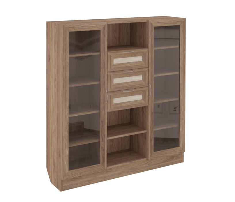 ШК-10 Изделие представляет собой универсальный высокий, книжный комод с застекленными секциями и выкатными ящиками. Корпус выполнен из Ламинированной ДСП высокого качества с насыщенным цветом. Наполнение комода представляет собой три вертикальных секции, средняя секция содержит три открытых ниши и три выкатных ящика. По бокам справа и слева расположены закрытые симметричные секции с распашными дверьми. В каждой такой секции по четыре полки. Фасады выполнены из материала МДФ.СТЕКЛО ТОНИРОВАННОЕ!!!