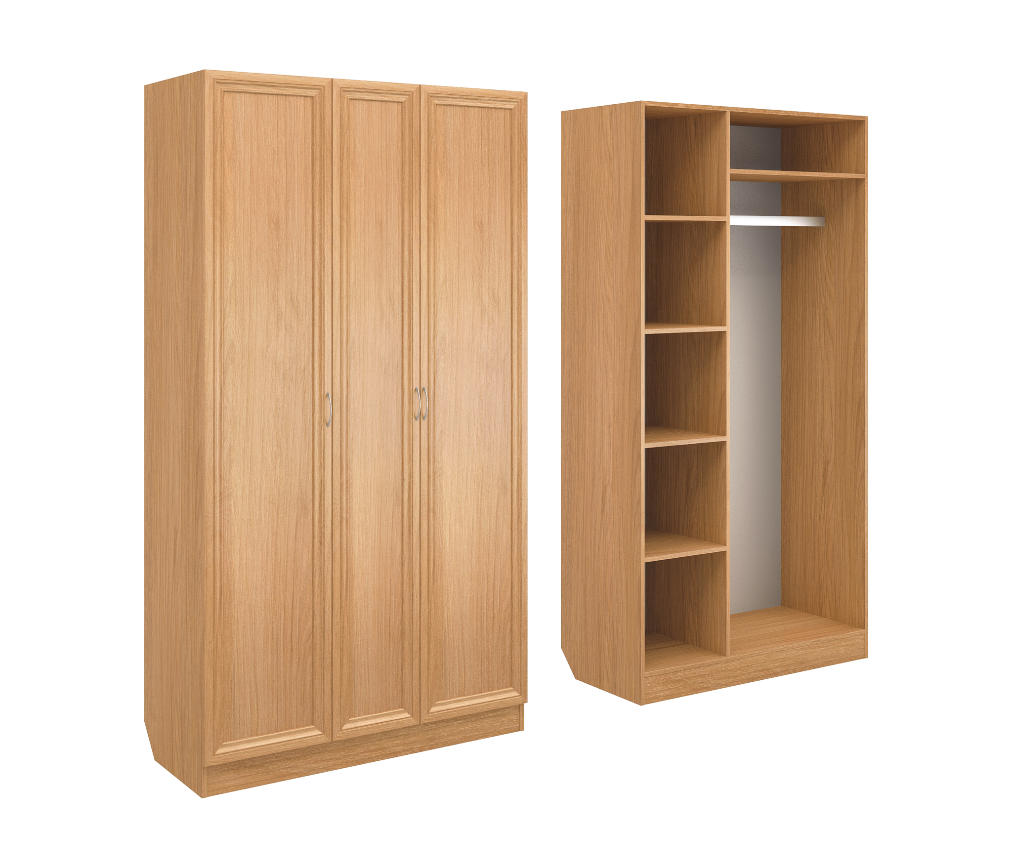 Корпус шкафа выполнен из Ламинированной ДСП высокого качества с насыщенным цветом. Фасады выполнены из материала МДФ.Ширина шкафа 90 см., большая и функциональная трёхстворчатая модель. В левой секции ниши для сложенных вещей. Справа штанга для одежды.