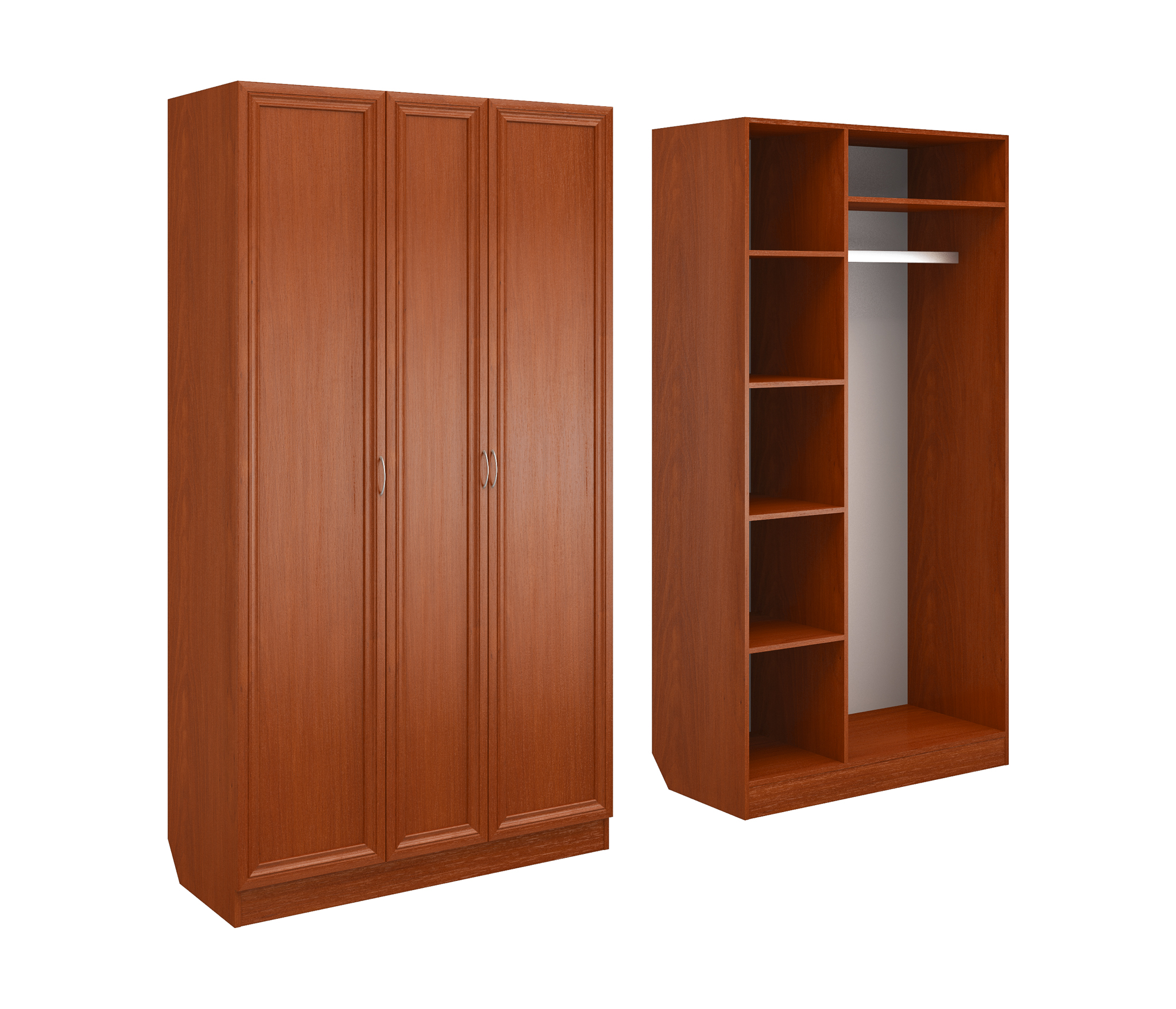 Корпус шкафа выполнен из Ламинированной ДСП высокого качества с насыщенным цветом. Фасады выполнены из материала МДФ.Ширина шкафа 90 см., большая и функциональная трёхстворчатая модель. В левой секции ниши для сложенных вещей. Справа штанга для одежды.