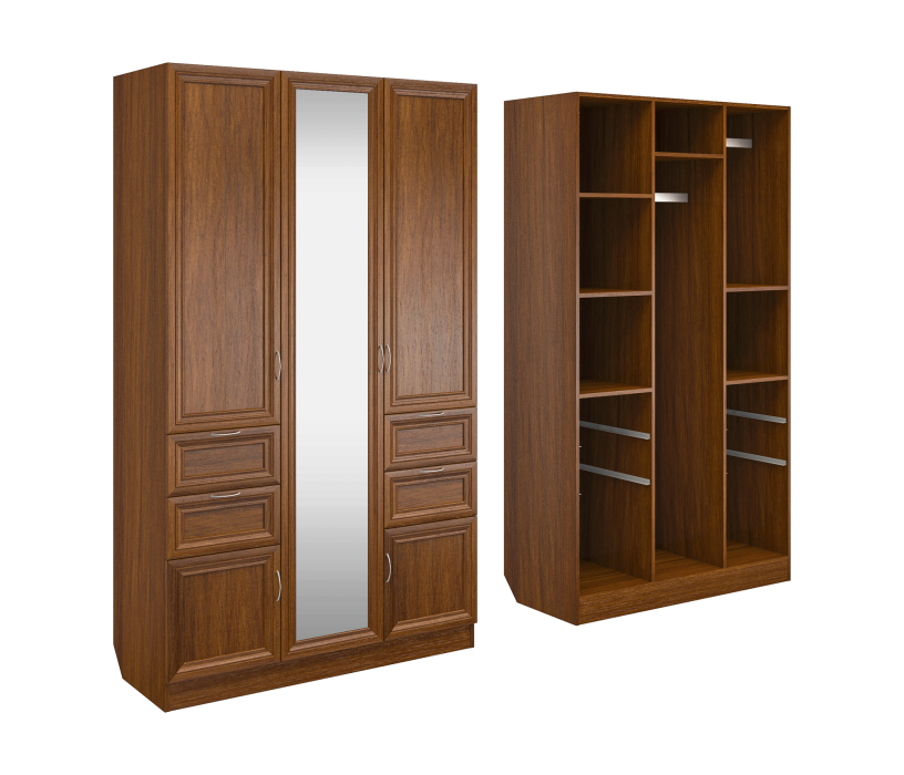 Корпус шкафа выполнен из Ламинированной ДСП высокого качества с насыщенным цветом. Фасады выполнены из материала МДФ.Большая и функциональная модель шириною 120 см., со множеством отделений закрытыми пятью распашными дверками. Вверху слева за дверью четыре ниши. Справа отделение со штангой и ниша внизу. Слева и Справа симметрично друг другу расположены по два выкатных ящика, и по две ниши с небольшими распашными дверцами. За центральной дверью большая, вертикальная секция со штангой для вешалок.В данной моделе установлено зеркало, которое вмонтировано на производстве в рамку фасада двери шкафа