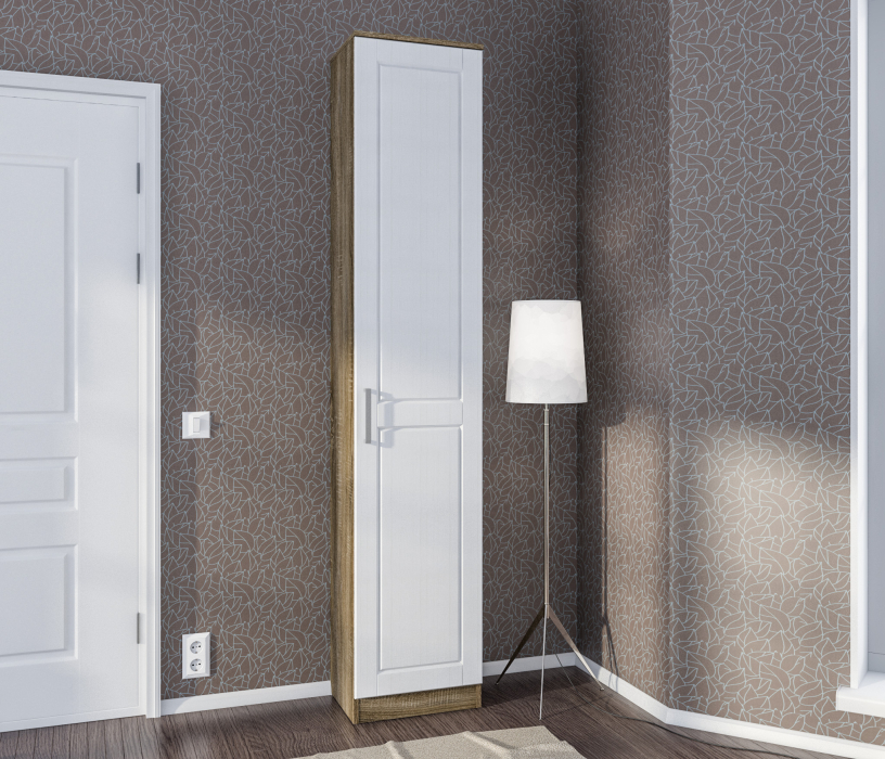 Выполнен шкаф из современного и прочного материала. Внешняя отделка комбинированная. Корпус выполнен из КДСП в цвете «Дуб Сонома Трюфель». А фасадная поверхность – из МДФ в цвете «Сандал Белый». Шкаф Илона органичен как отдельный предмет мебели, но может стать частью гарнитура.