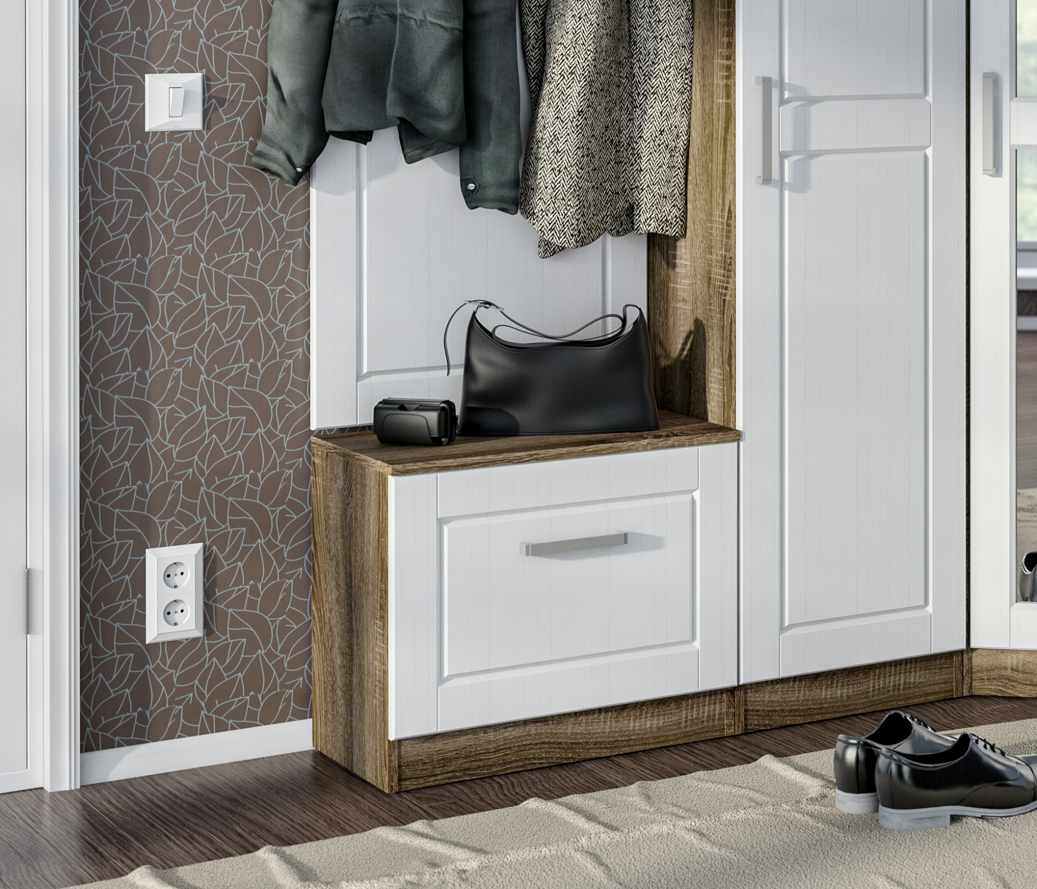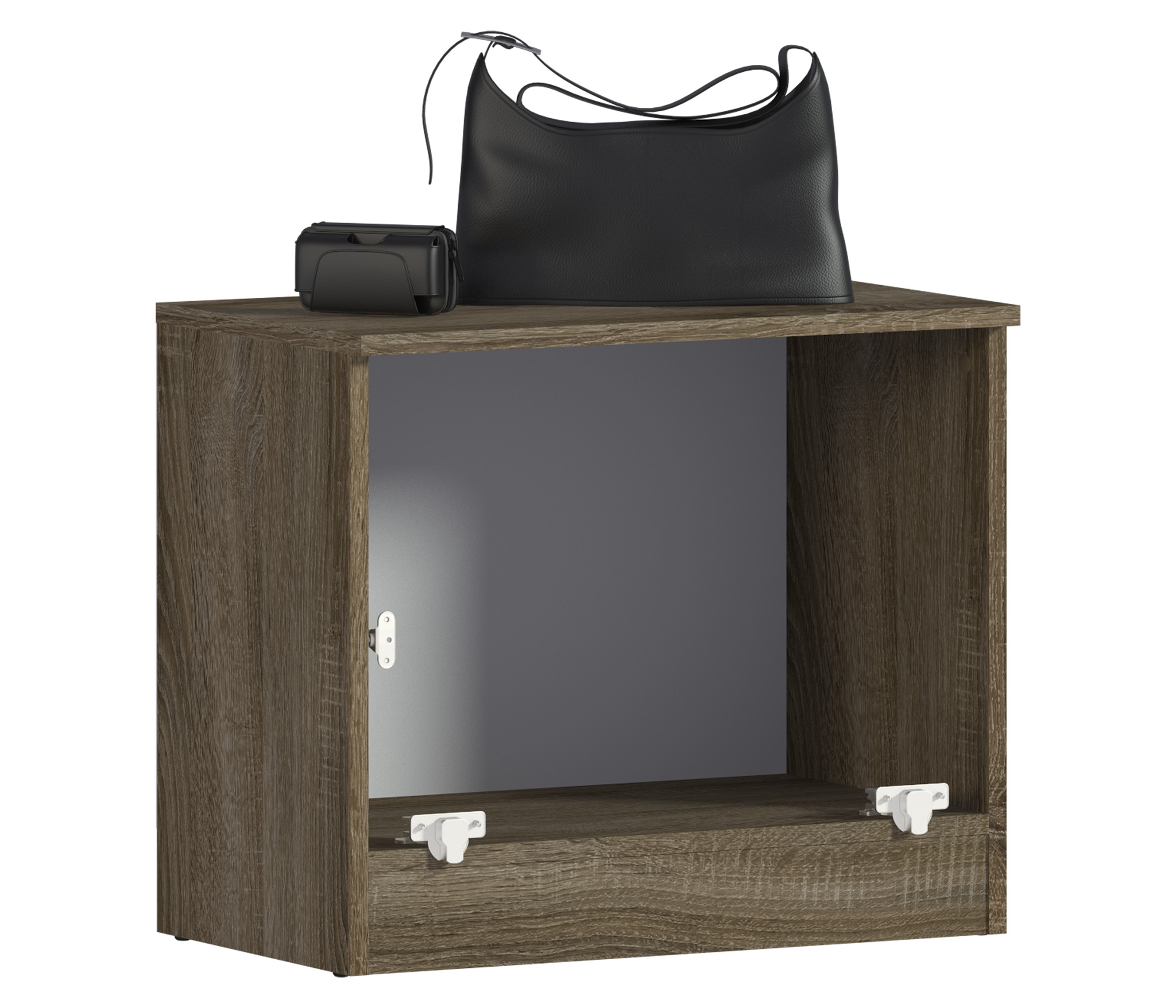 Корпус тумбы выполнен из КДСП в цвете «Дуб Сонома Трюфель». А фасадная поверхность – из МДФ в цвете «Сандал Белый».