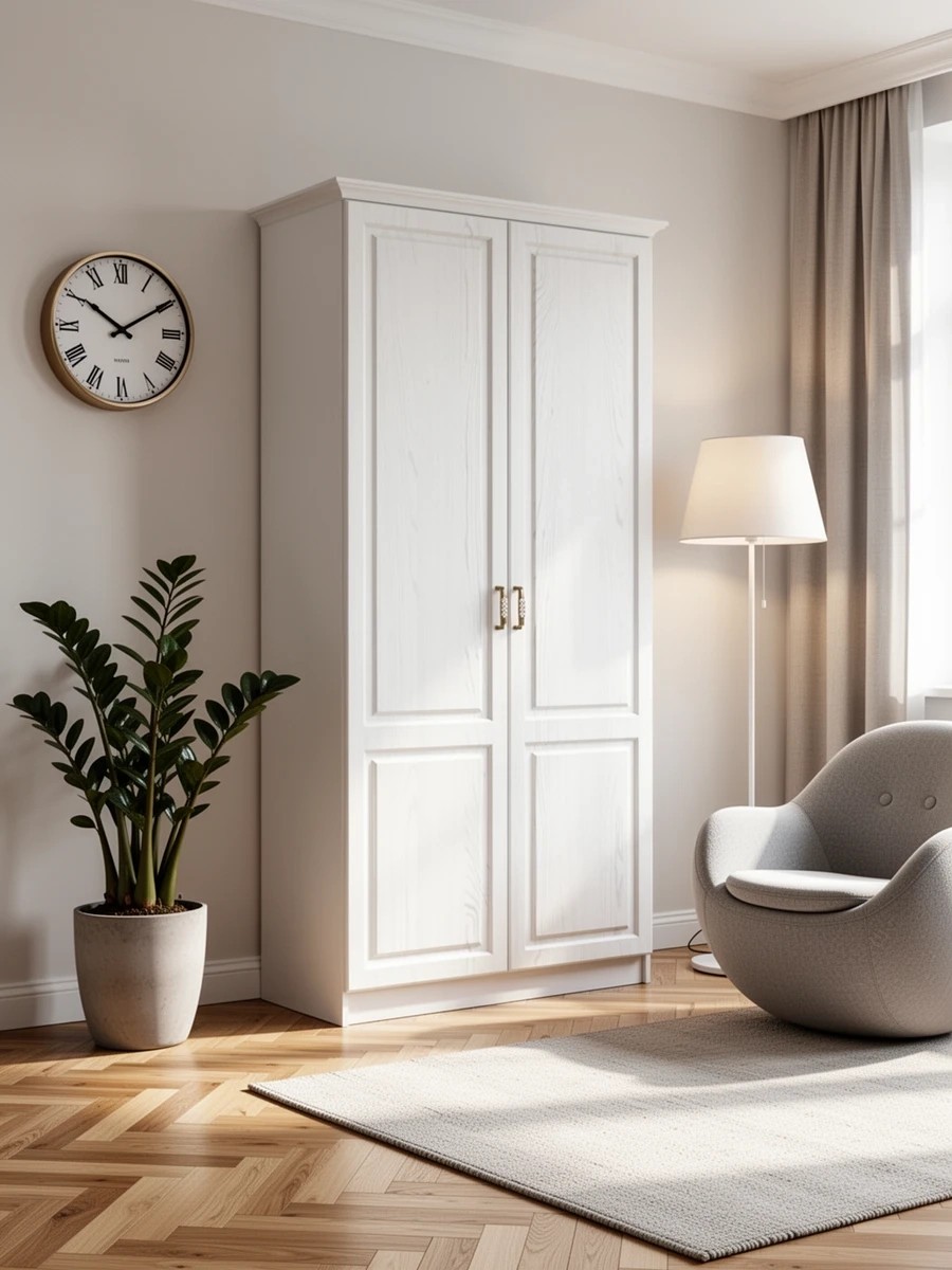 Шкаф довольно компактный с габаритными размерами ширина 88 см, высота 221 см и глубина 57 см. За двумя дверцами располагается просторное плательное отделение со штангой, верхняя и нижняя полки для хранения сезонной одежды и обуви. Отличительной особенностью шкафа является зеркало во всю высоту одной из дверей. Выполнен шкаф из современного и прочного материала. Внешняя отделка комбинированная. Корпус выполнен из КДСП в цвете «Дуб Сонома Трюфель». А фасадная поверхность – из МДФ в цвете «Сандал Белый». Шкаф Илона органичен как отдельный предмет мебели, но может стать и частью гарнитура.