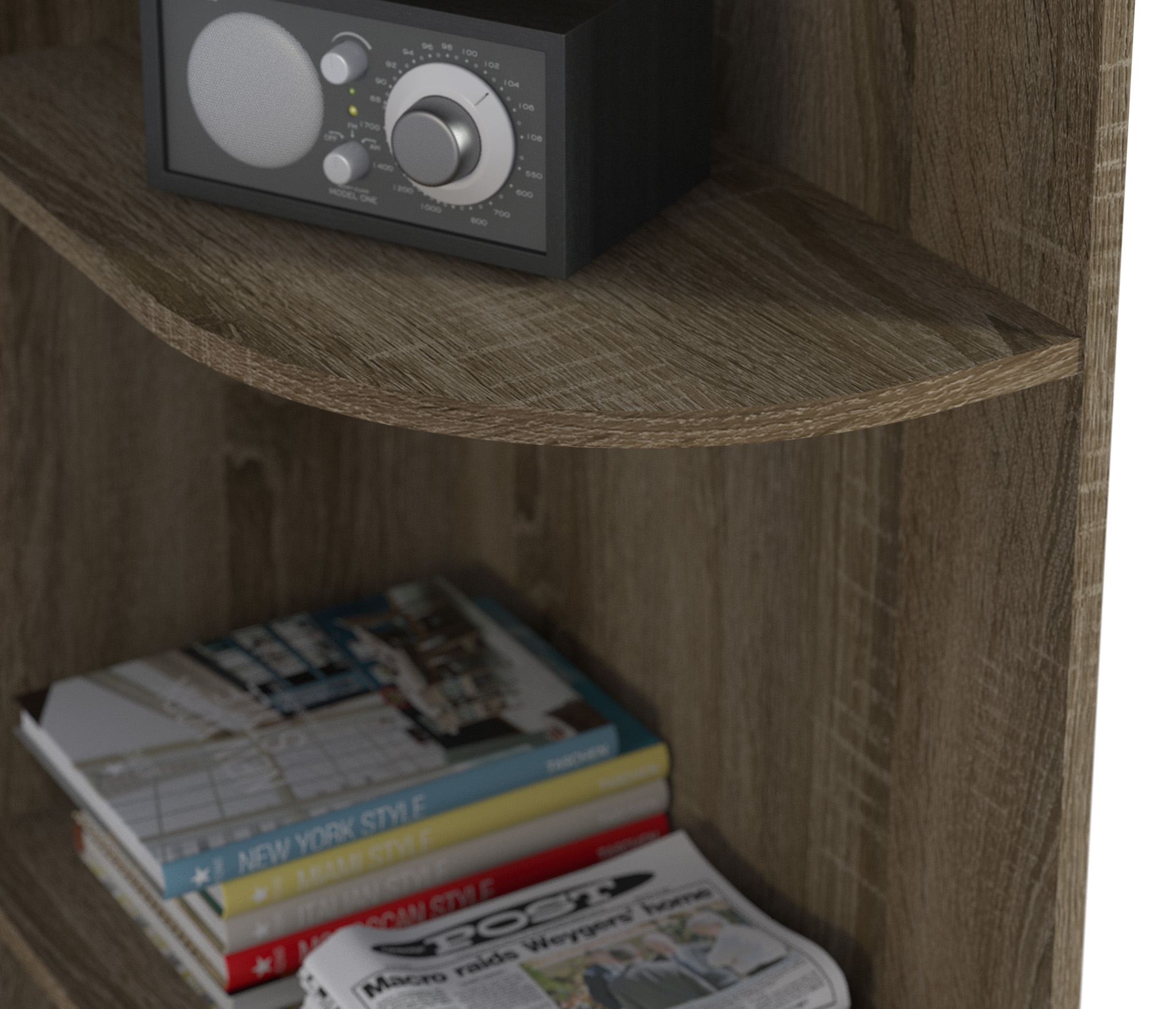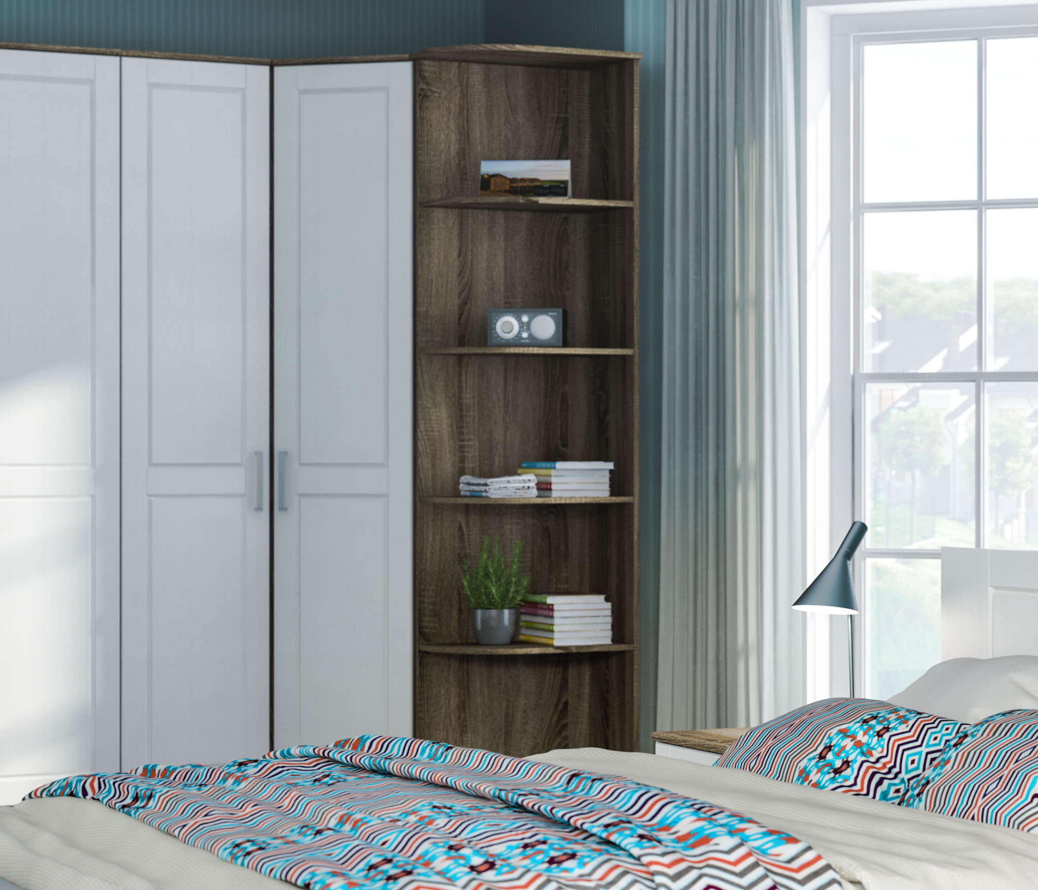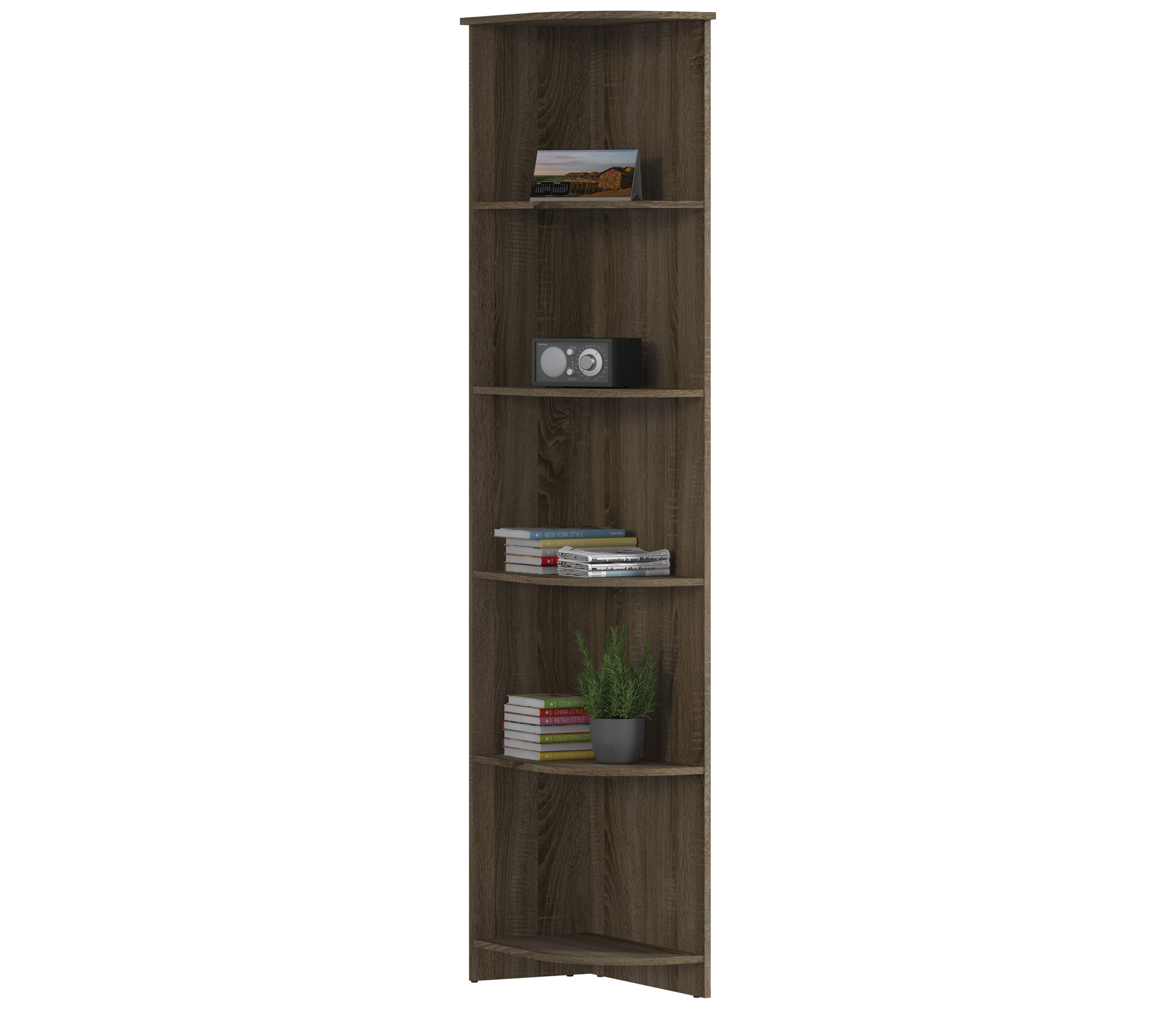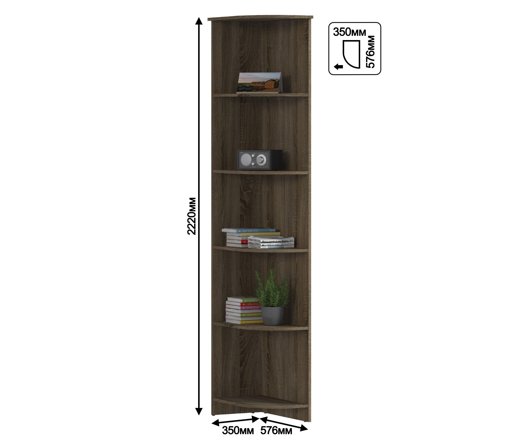 Габаритные размеры – ширина 35 см, высота 220 см и глубина 55 см. В конструкции стеллажа пять открытых полок. Он может быть стилизован в модульную систему Илона, либо быть автономным предметом мебели. Выполнен стеллаж из современного прочного КДСП, в цвете «Дуб Сонома Трюфель».