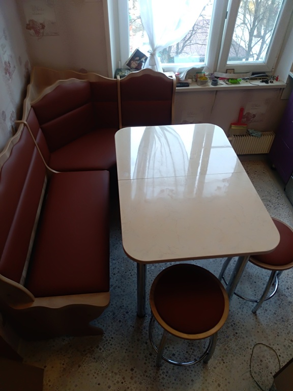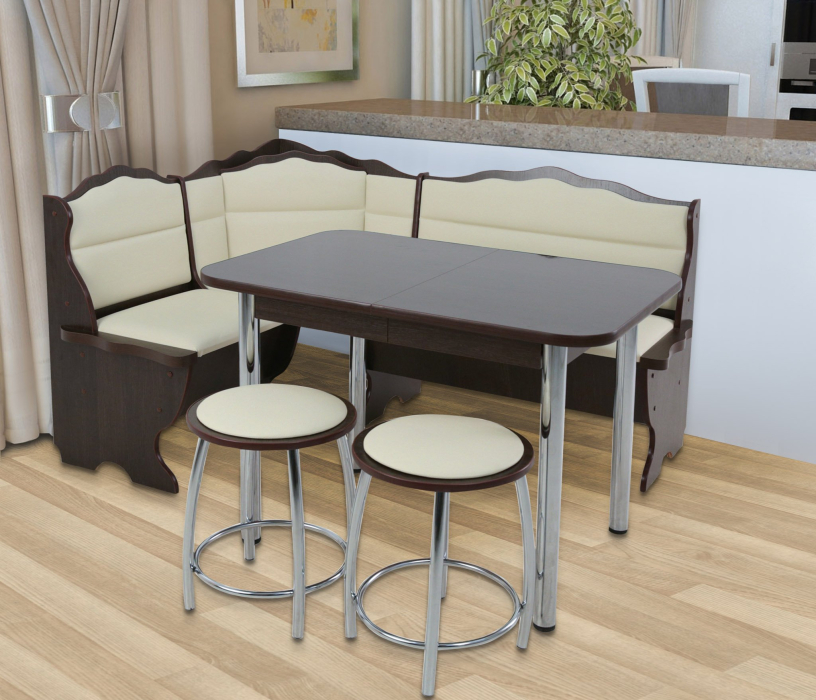 В комплект кухонного уголка «Ривьера» входят: угловая скамья, обеденный стол раздвижной и 2 табурета.