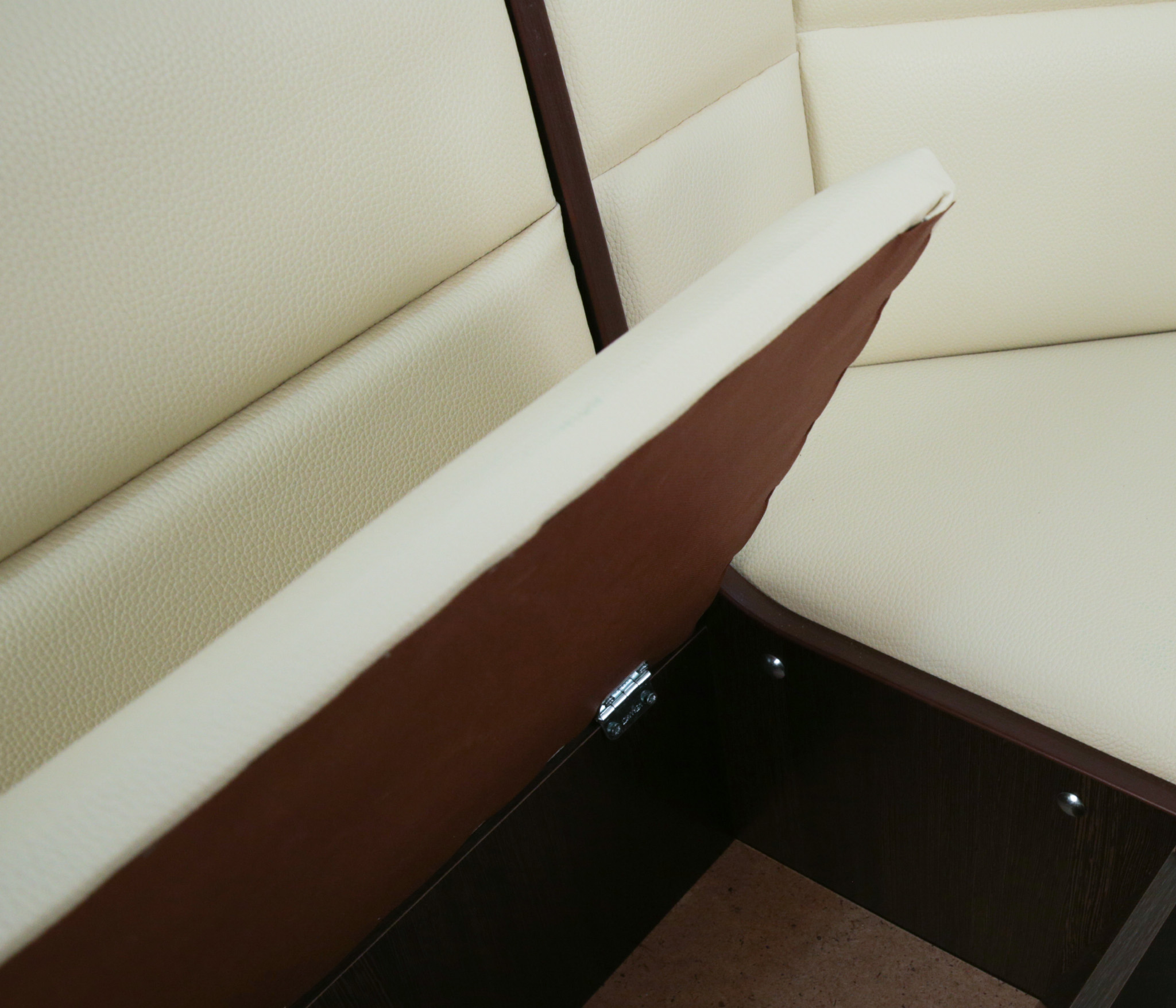 Обивка Экокожа.Мягкая и отлично смотрится.Под сидениями есть ящики для хранения.